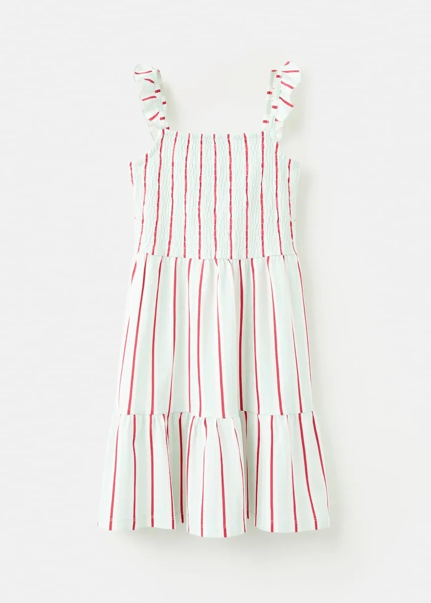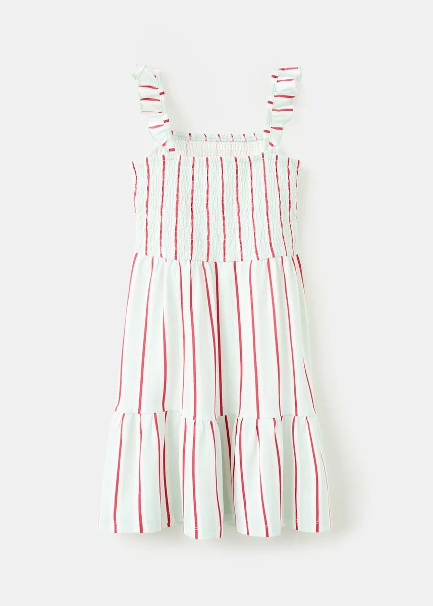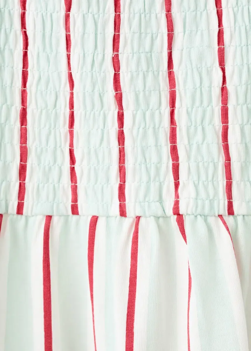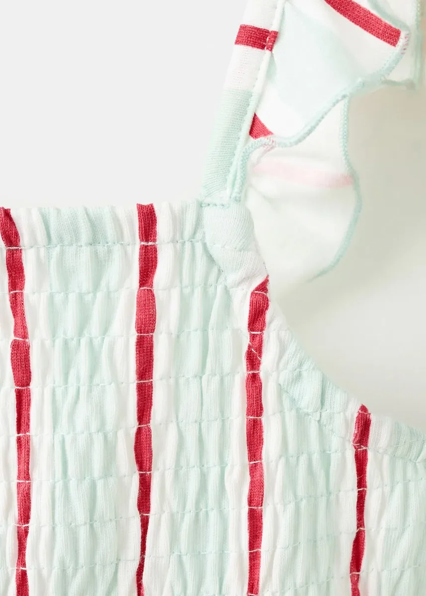 Tessuto in cotone. Design a righe. Dettaglio arricciato sul davanti. Motivo a nido d’ape. Spalline arricciate. Volant sul fondo