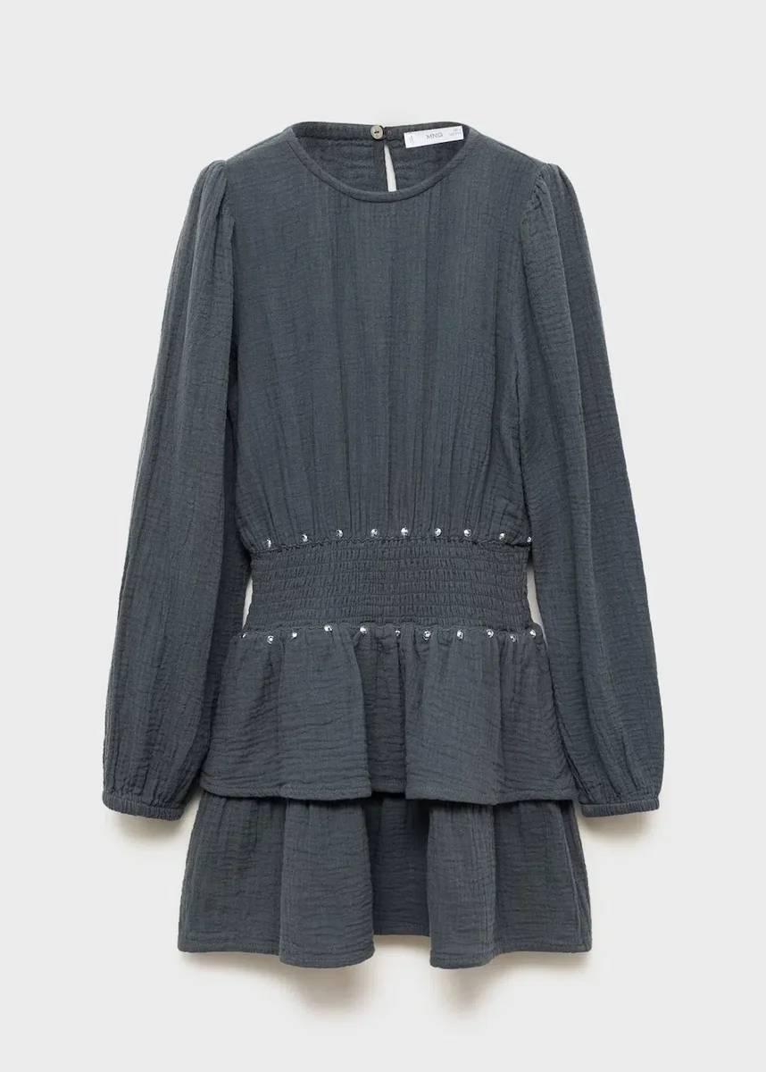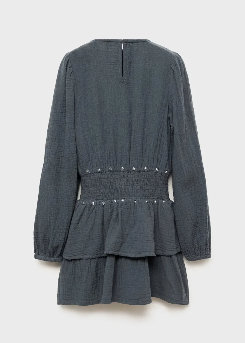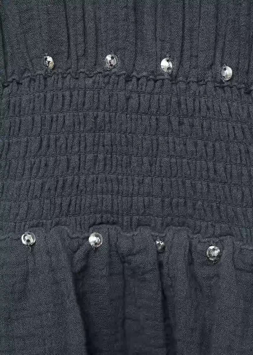 Tessuto 100% cotone. Tessuto bambula. Design con volant. Scollo rotondo con chiusura a bottoni. Maniche a sbuffo. Dettaglio a nido d’ape in vita. Volant sull’orlo. Dettaglio con paillettes. Chiusura con bottoni sul retro. Black Friday.