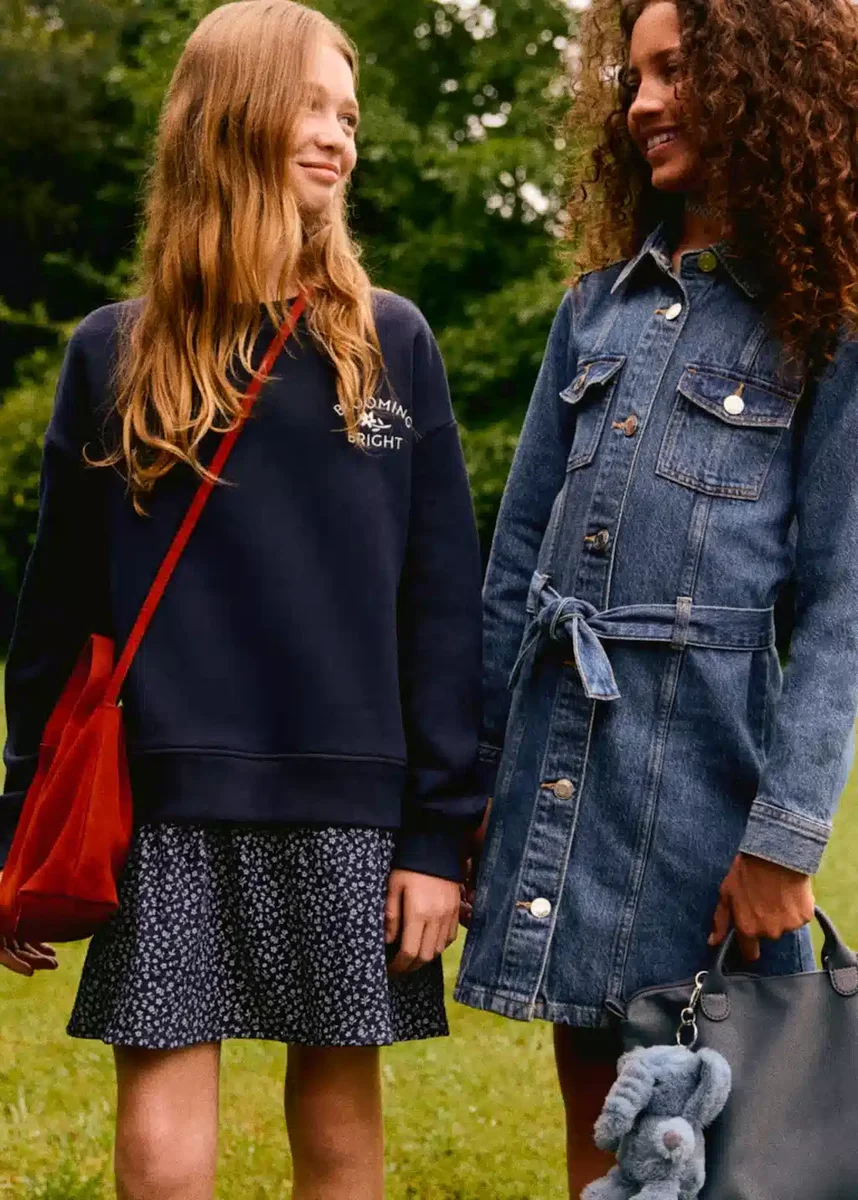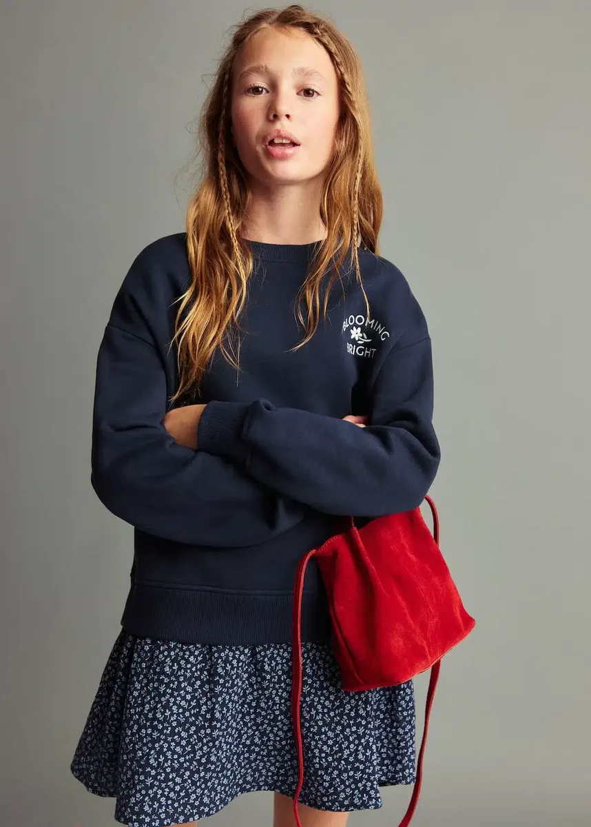 Tessuto 100% cotone. Modello svasato. Motivo floreale. Doppio strato. Ricamo sul davanti. Girocollo. Maniche lunghe. Ritorno a scuola