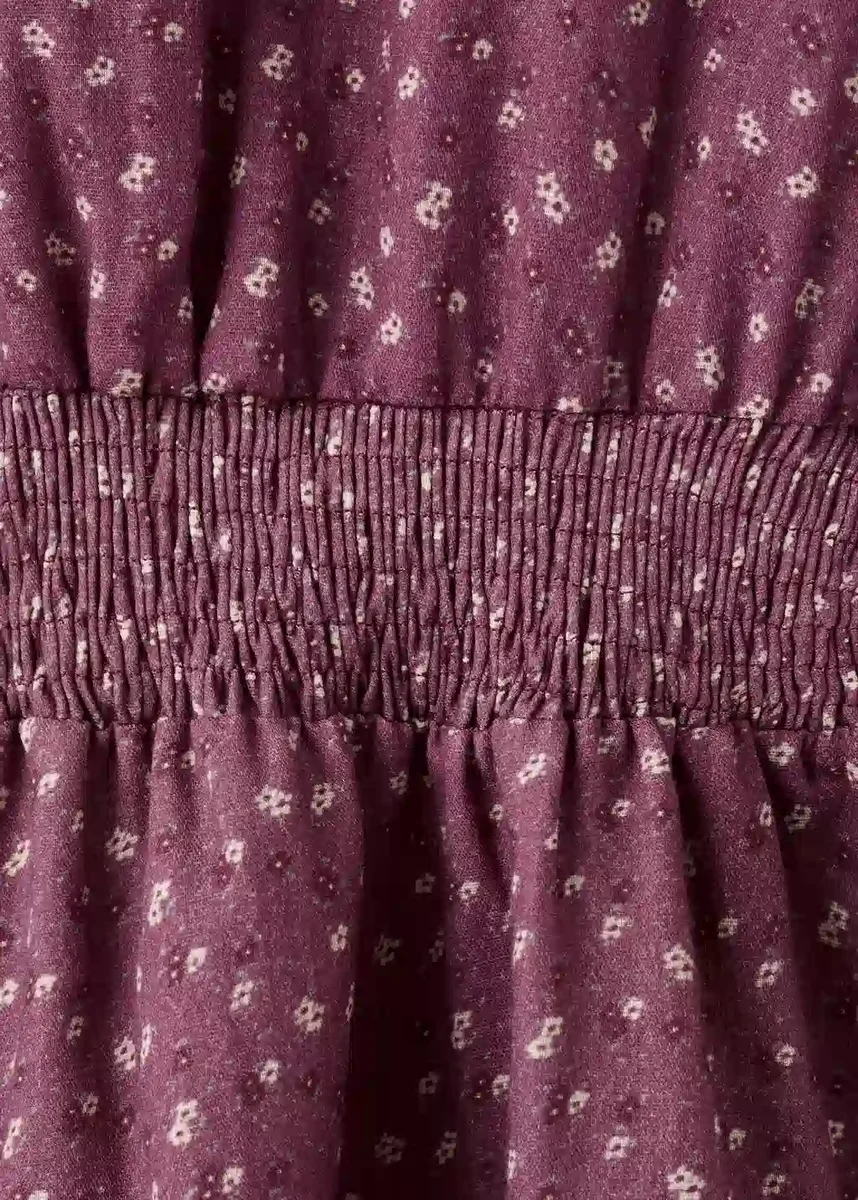 Tessuto 100% cotone. Design svasato. Stampa floreale. Girocollo con chiusura a bottoni. Maniche lunghe a sbuffo. Pannello in vita arricciato