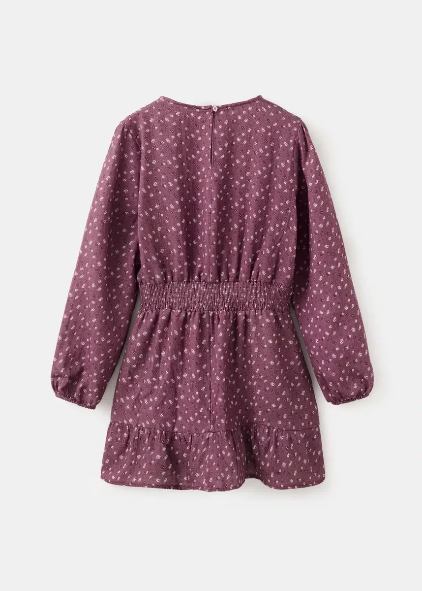 Tessuto 100% cotone. Modello svasato. Stampa floreale. Girocollo con chiusura con bottoni. Maniche lunghe a sbuffo. Pannello arricciato in vita.