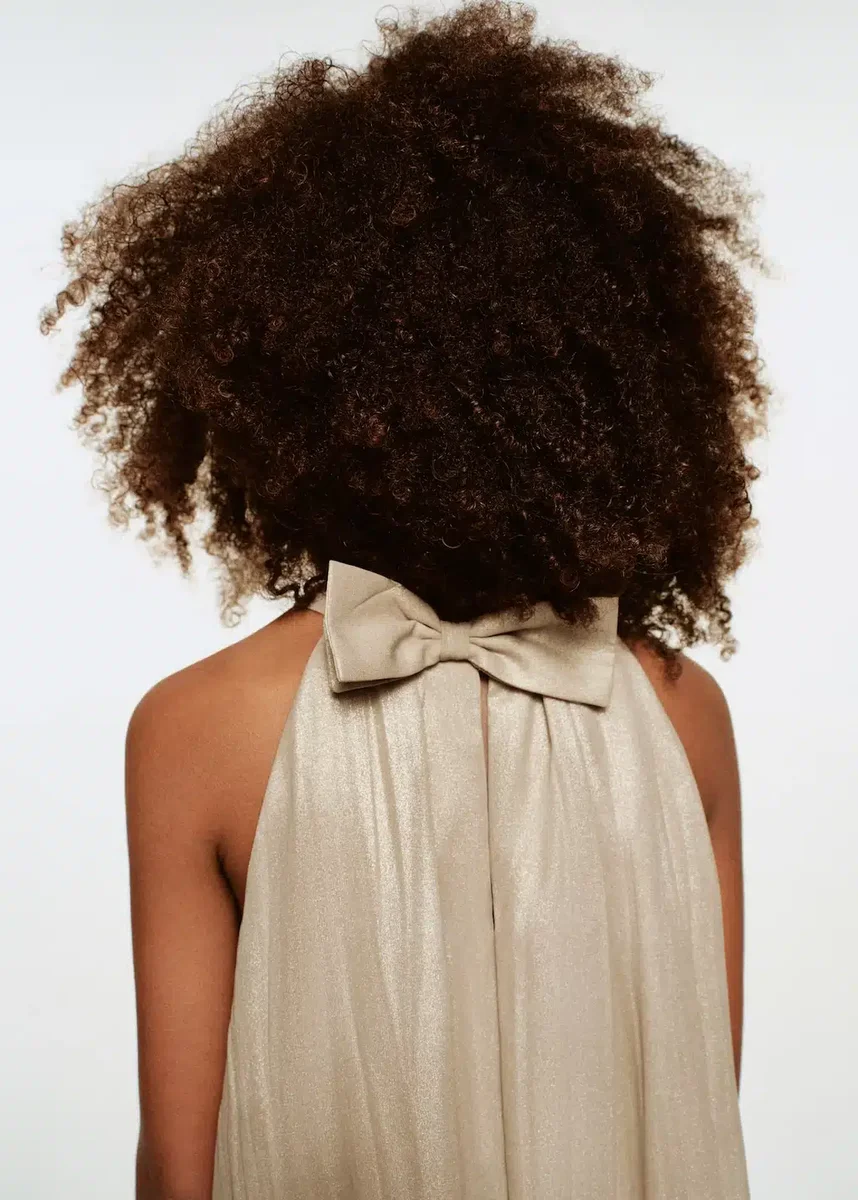 Tessuto metallizzato. Modello corto. Girocollo. Senza maniche. Dettaglio fiocco. Collezione Party