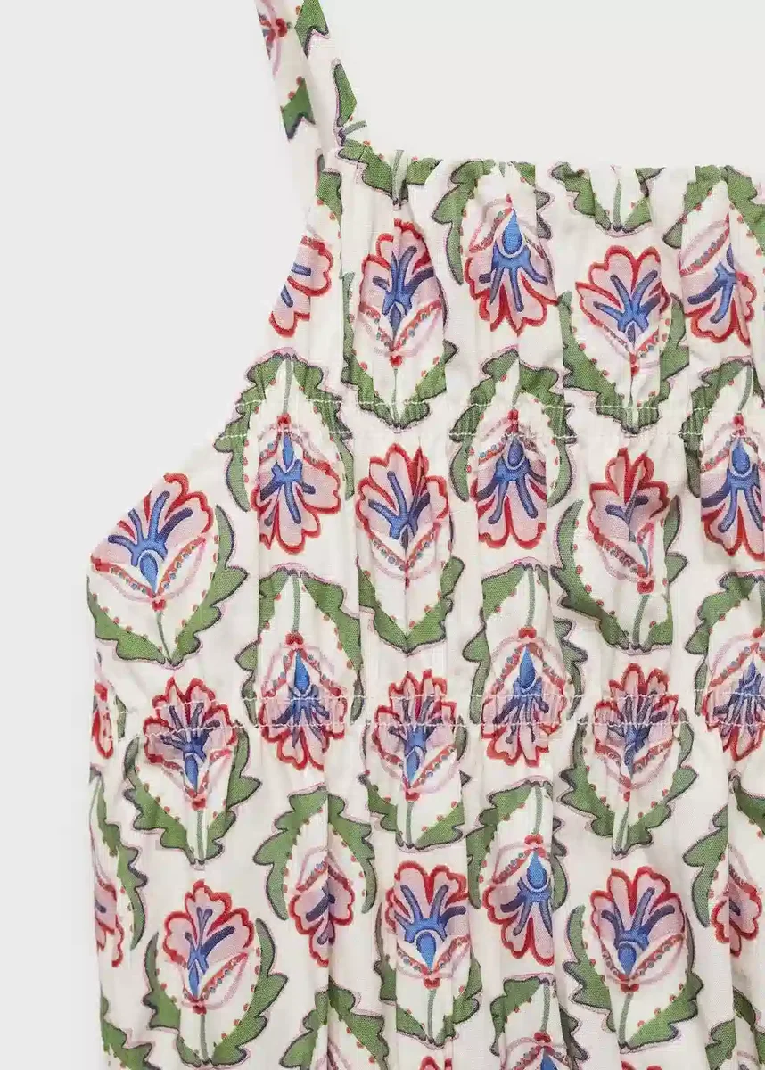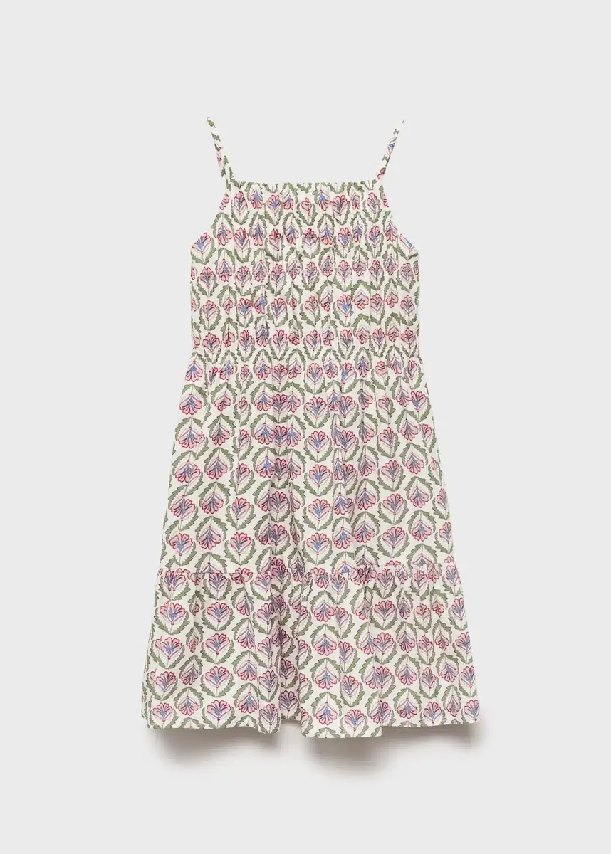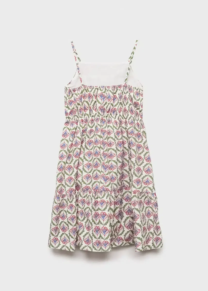 Tessuto 100% cotone. Stampa floreale. Scollo dritto. Spalline sottili. Pannello arricciato. Volant sul fondo. Con fodera interna. Senza chiusura