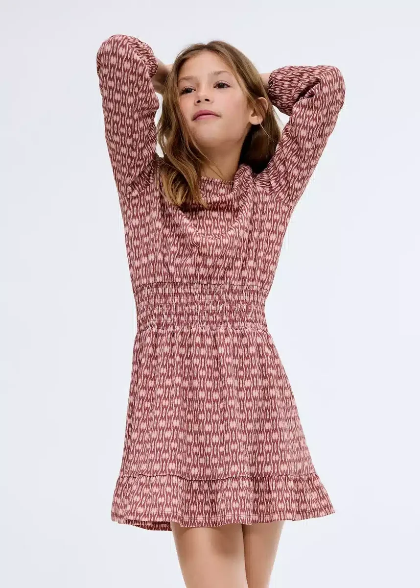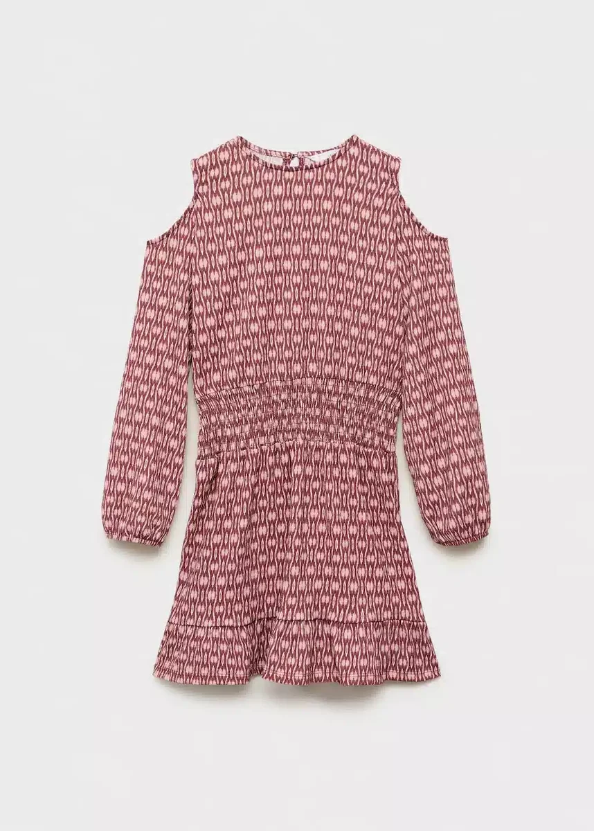Tessuto fluido. Modello svasato. Stampa. Girocollo. Chiusura con bottoni sul retro. Maniche lunghe. Dettagli cut-out sulle spalle. Pannello arricciato in vita. Volant sul fondo. Black Friday.
