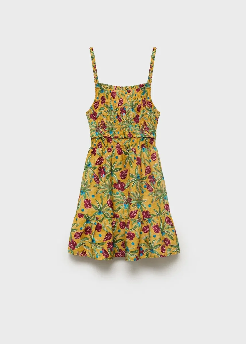 Tessuto in viscosa. Modello svasato. Modello corto. Stampa floreale. Parte superiore arricciata. Collo dritto. Spalline sottili. Chiusura con lacci sul retro. Finitura con volant sul fondo.