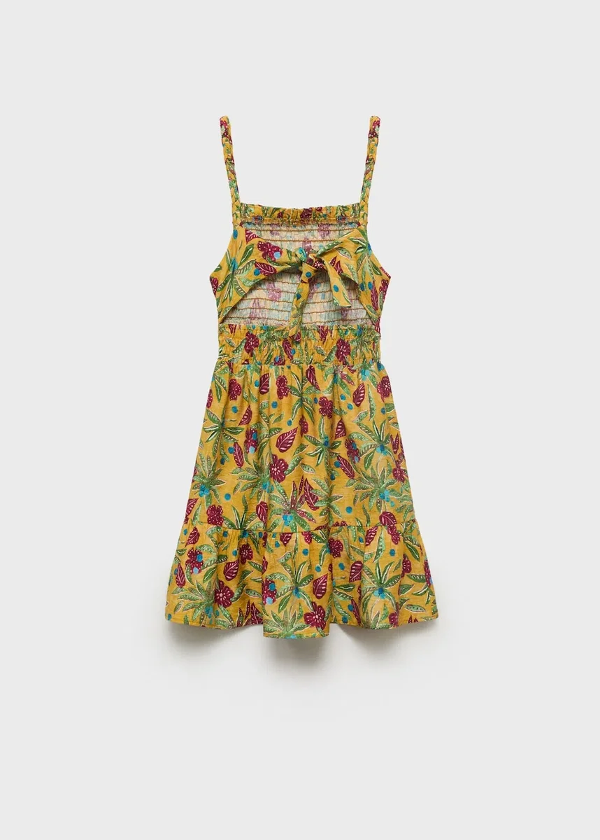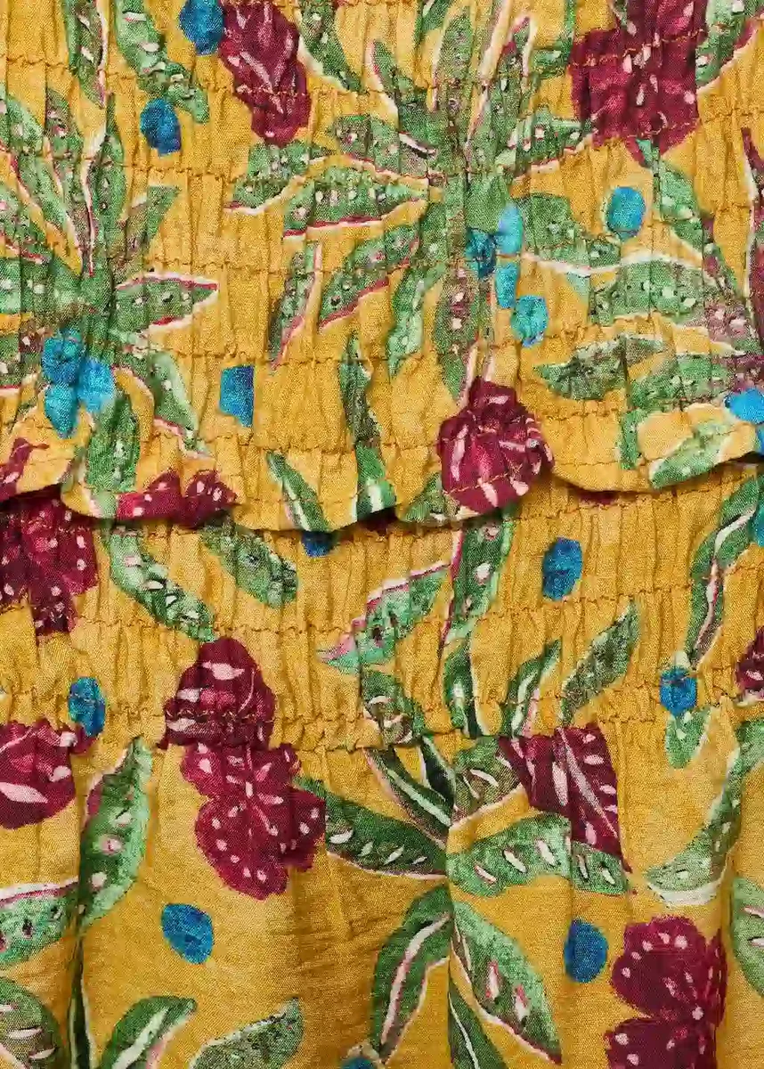 Tessuto in viscosa. Modello svasato. Modello corto. Stampa floreale. Sezione arricciata nella parte superiore. Collo dritto. Spalline sottili. Chiusura con lacci sul retro. Rifinito con volant sul fondo