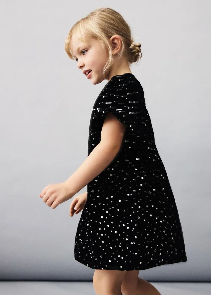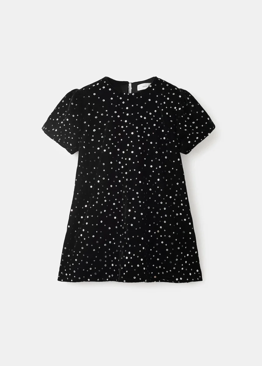 Tessuto in velluto. Design svasato. Dettagli in paillettes. Girocollo con chiusura a bottoni. Maniche corte. Collezione Party. Collezione Natale.