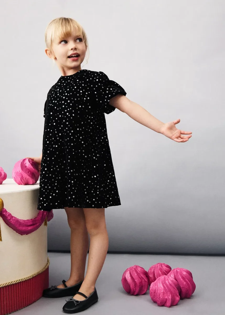 Tessuto in velluto. Design svasato. Dettagli con paillettes. Girocollo con chiusura a bottoni. Maniche corte. Collezione Party. Collezione Natale