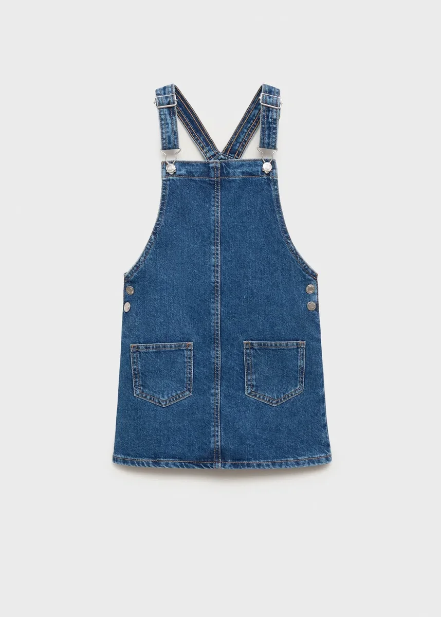 Tessuto 100% cotone. Tessuto denim. Modello dritto. Modello corto. Scollo dritto. Spalline con chiusura a bottoni. Spalline regolabili. Chiusura con bottoni laterali. Due tasche applicate sul davanti