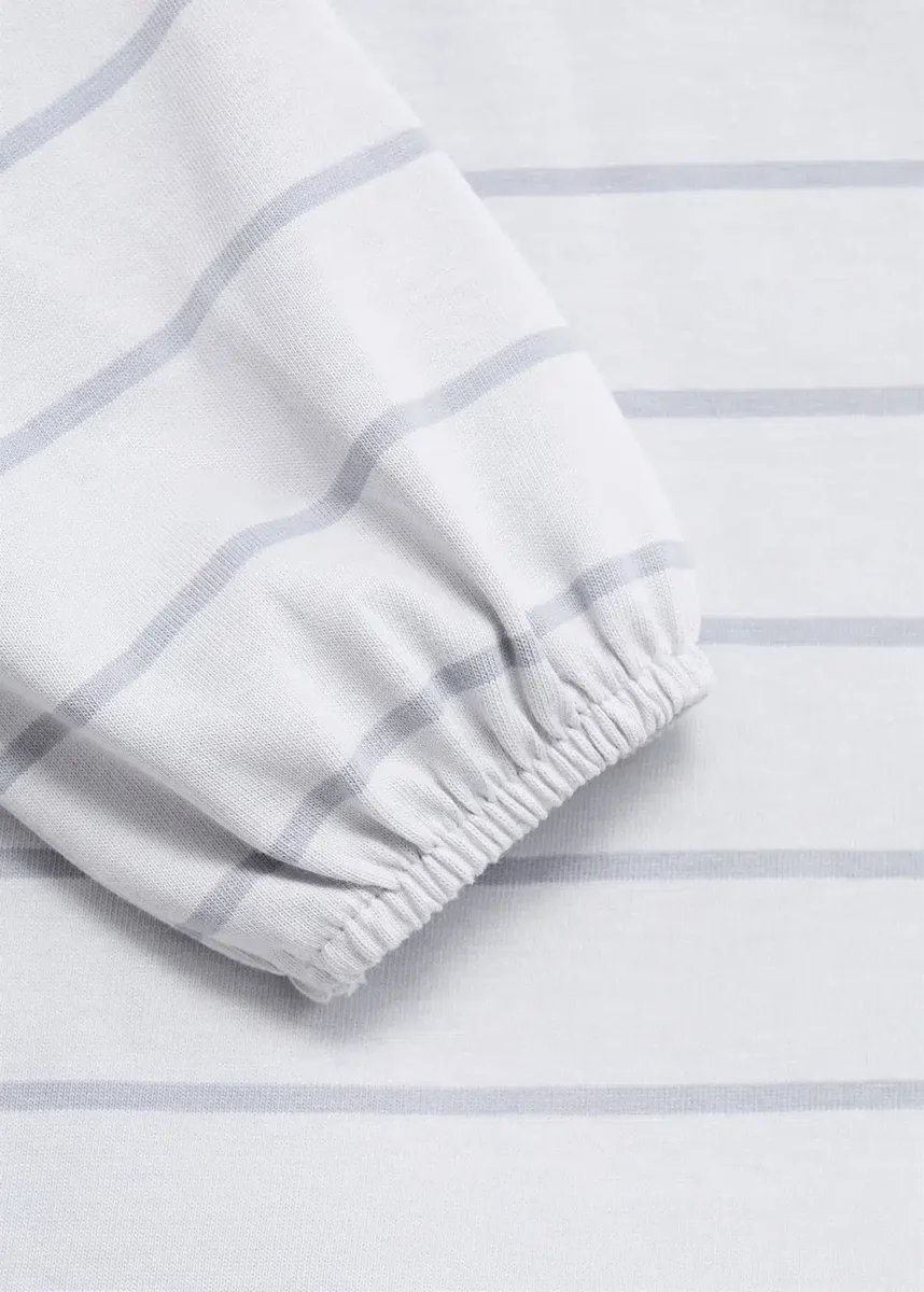 100% cotone. Tessuto a righe. Taglio svasato. Scollo rotondo. Maniche lunghe con bordi a costine. Chiusura con bottoni sul retro. Orlo con volant.