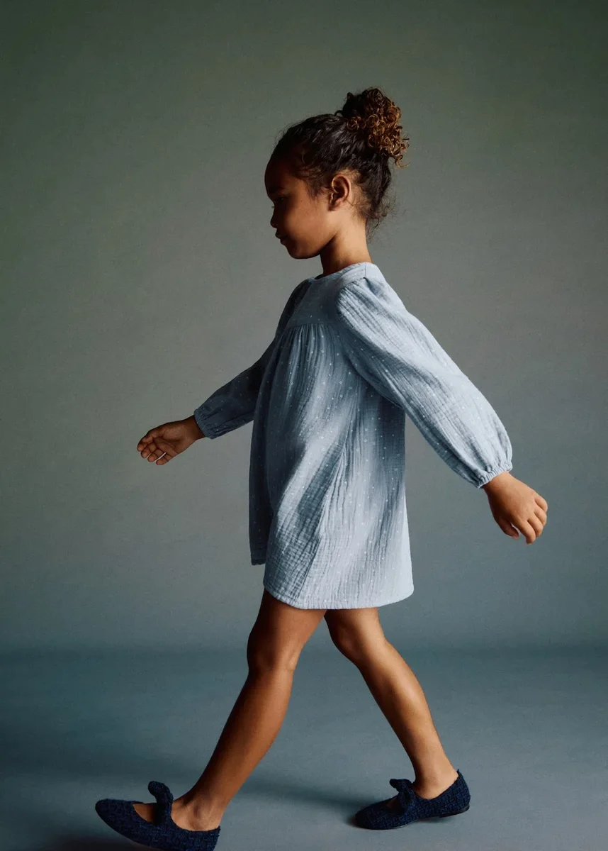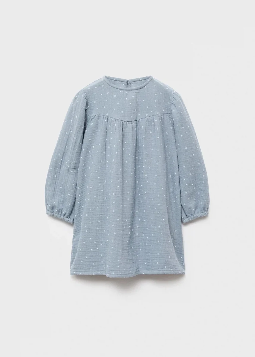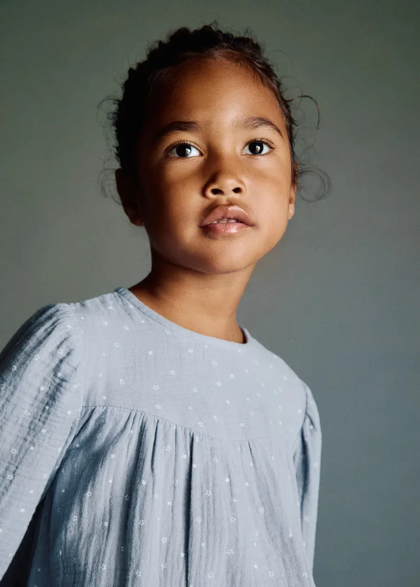 Tessuto 100% cotone. Tessuto Bambula. Modello lungo. Stampa. Stampa a stelle. Girocollo. Maniche lunghe con polsini elasticizzati. Dettaglio arricciato sulle maniche. Chiusura con bottoni sul retro. Black Friday