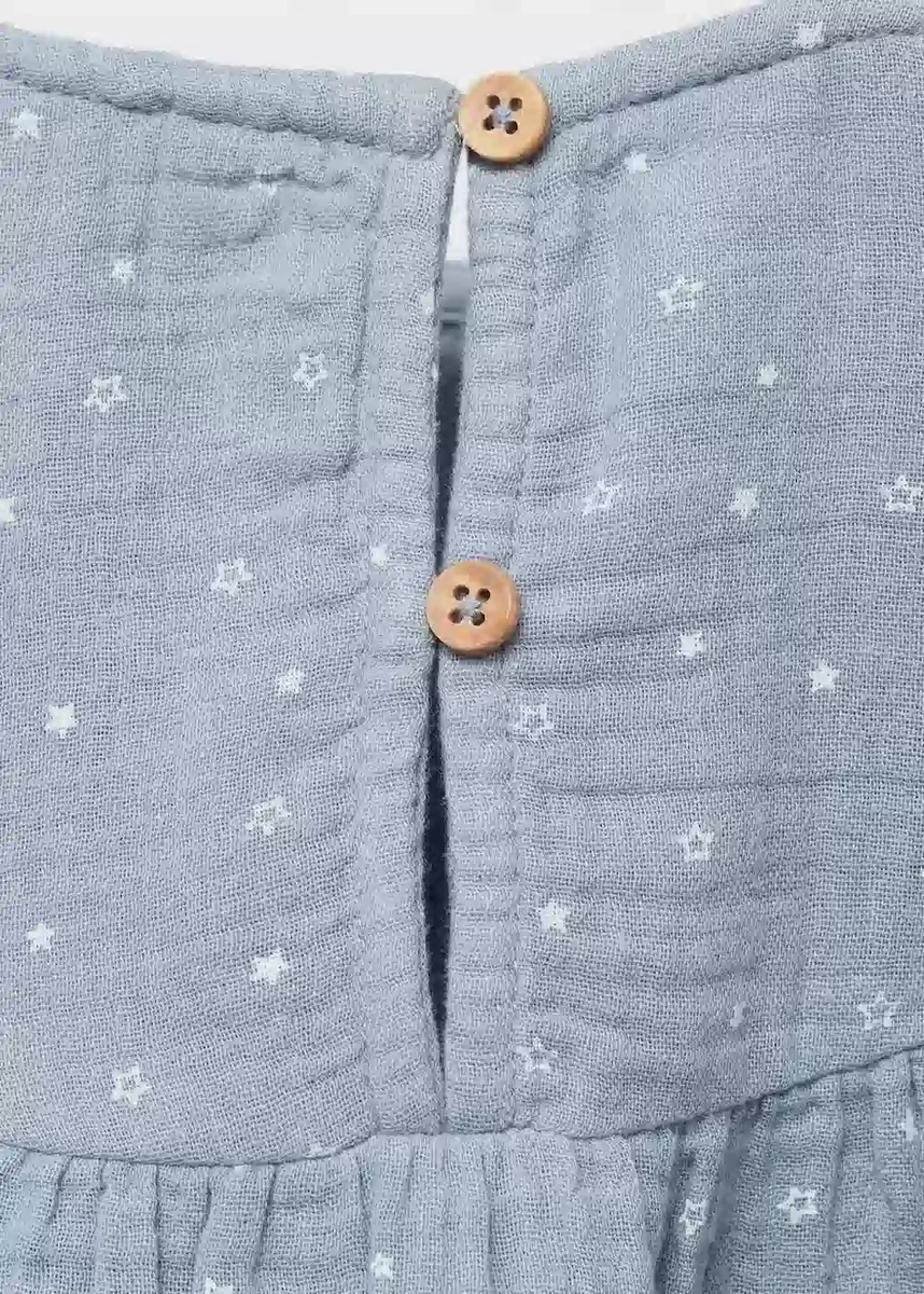 Tessuto 100% cotone. Tessuto bambula. Design lungo. Stampa. Stampa a stelle. Girocollo. Maniche lunghe con polsini elasticizzati. Dettaglio arricciato sulle maniche. Chiusura con bottoni sul retro. Black Friday