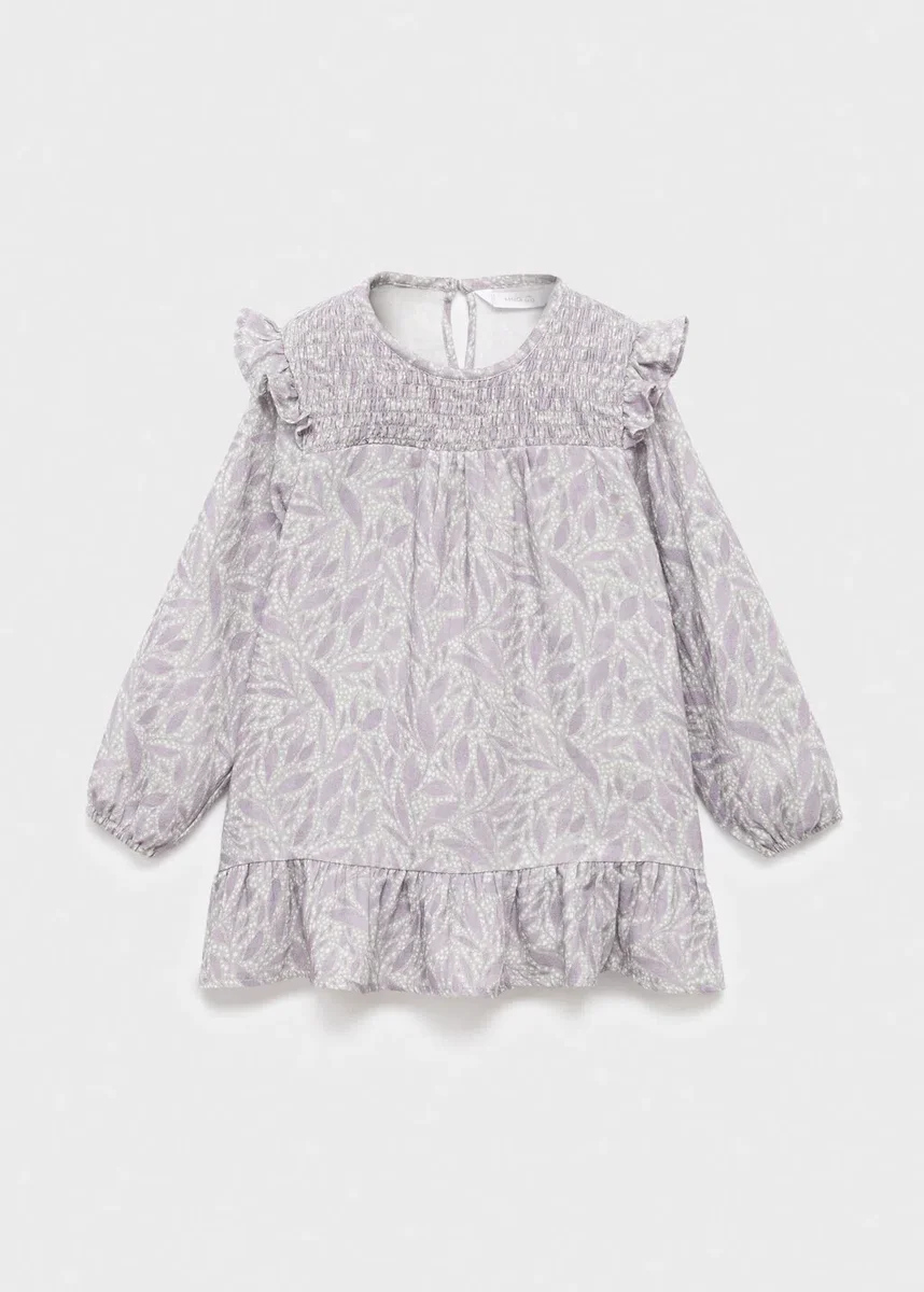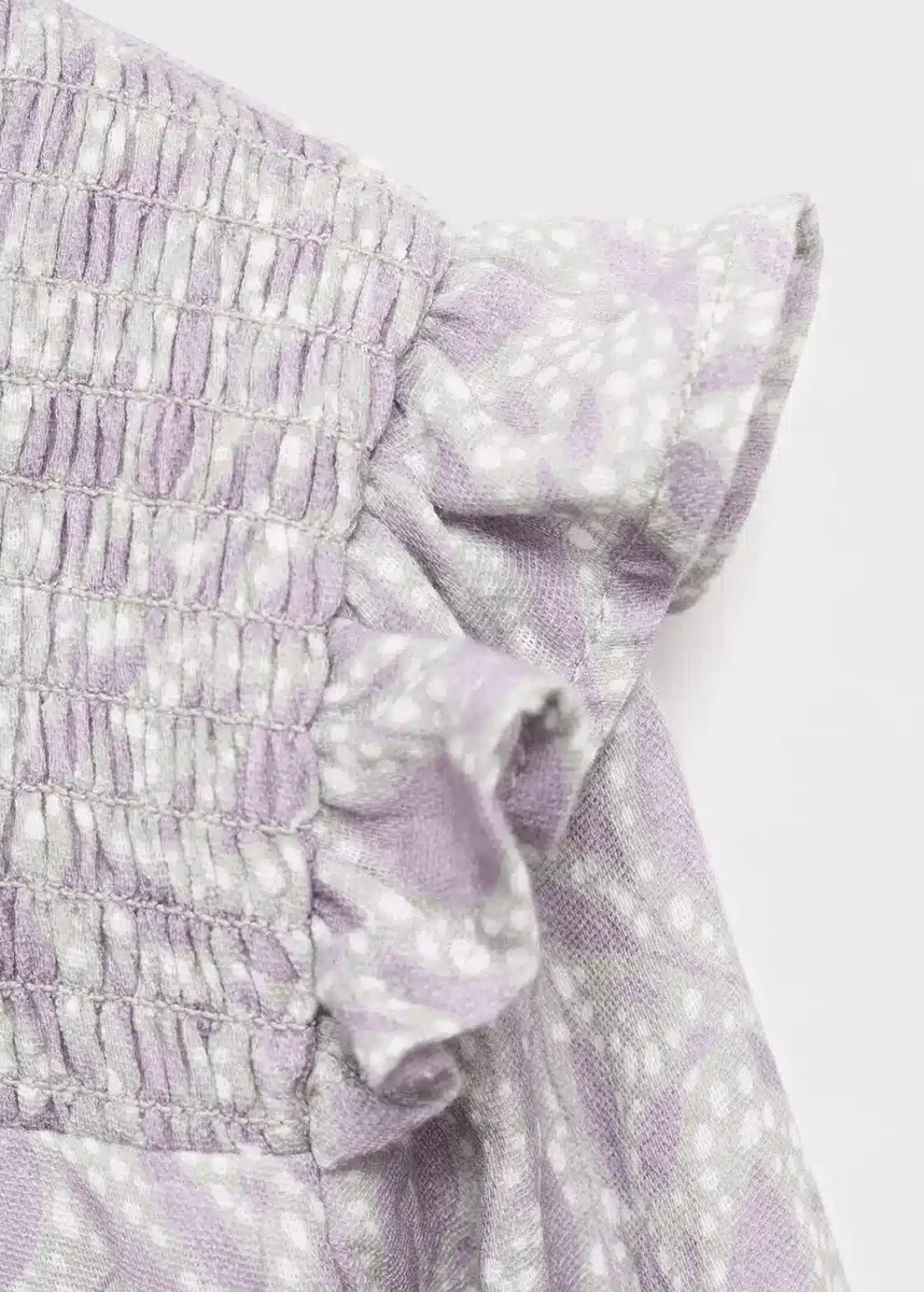 Tessuto 100% cotone. Modello corto. Modello svasato. Stampa. Stampa floreale. Motivo a nido d’ape. Scollo rotondo con chiusura a bottoni. Maniche lunghe con polsini elasticizzati. Volant sul fondo. Black Friday.