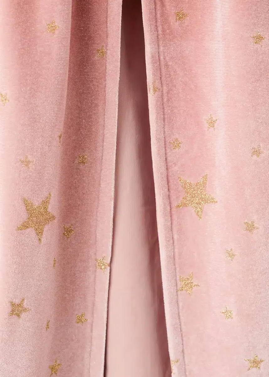 Tessuto in velluto. Design a strati. Disegno con stelle glitterate. Dettagli in tulle. Chiusura in velcro. Fodera interna. Gonna abbinata. Collezione Halloween.