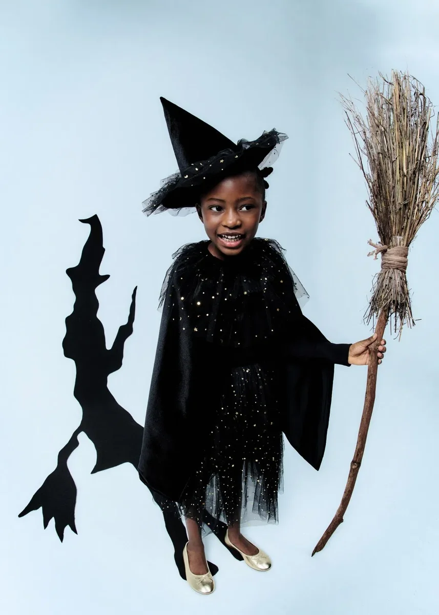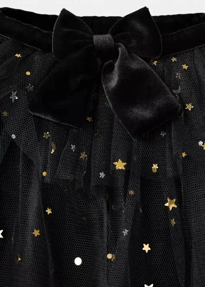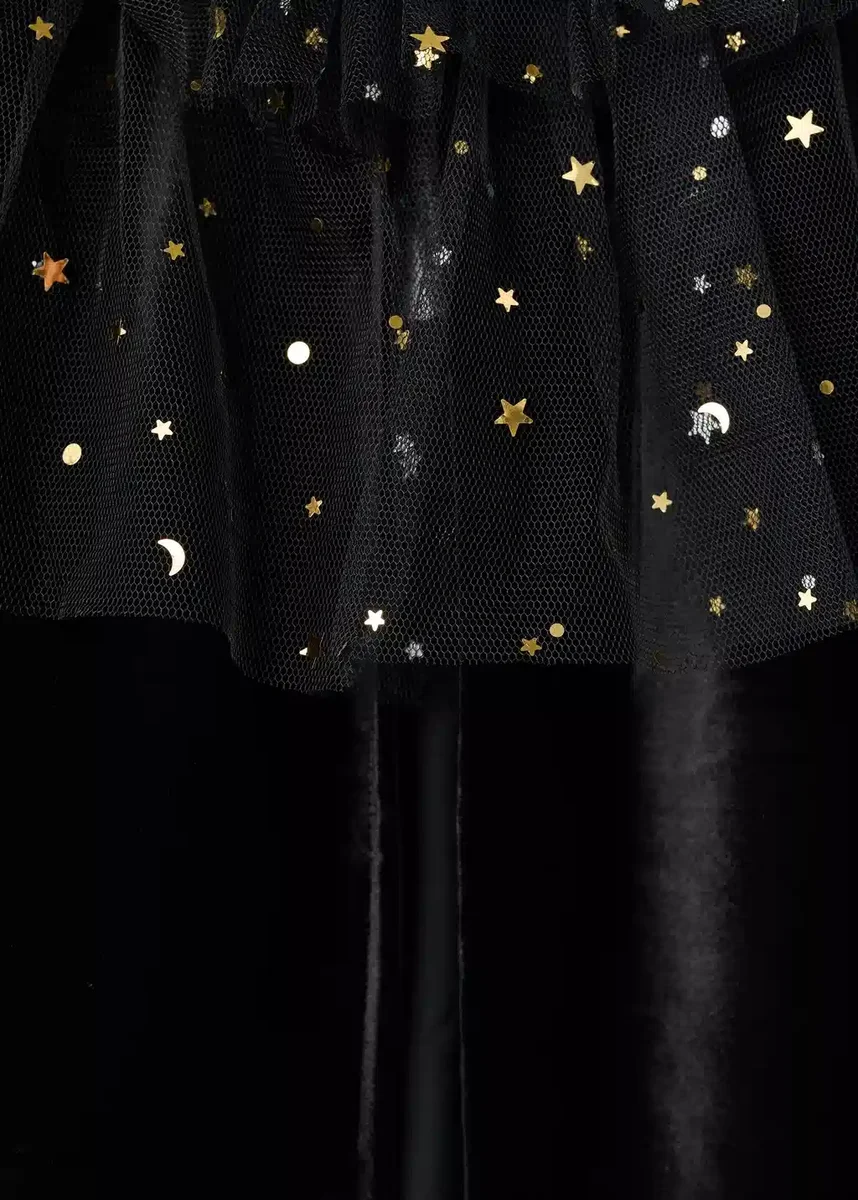 Tessuto in velluto. Dettagli in tulle. Disegno a stelle. Collezione Halloween. Chiusura con lacci. Total look