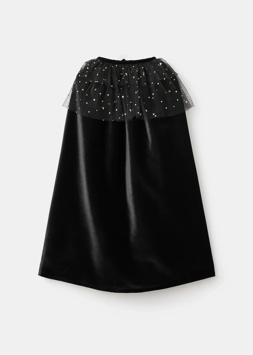 Tessuto in velluto. Dettagli in tulle. Disegno a stelle. Collezione Halloween. Chiusura con lacci. Total look.