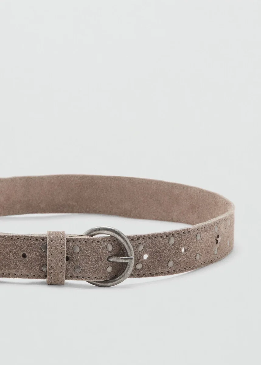 100% pelle bovina. Pelle scamosciata. Passante singolo. Fibbia rotonda. Dettagli borchiati.