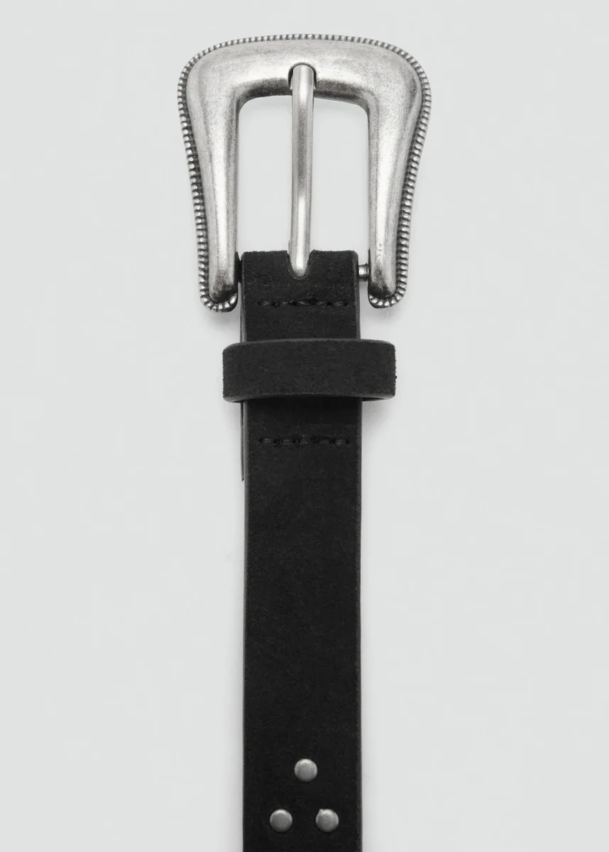 100% pelle bovina. Pelle scamosciata. Passante singolo. Dettagli borchiati. Chiusura con fibbia.