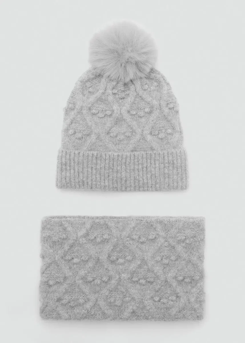 Tessuto lavorato a maglia. Design testurizzato. Orlo arrotolato. Nappa decorativa. Set disponibile. Questo cappello ha una sciarpa abbinata disponibile