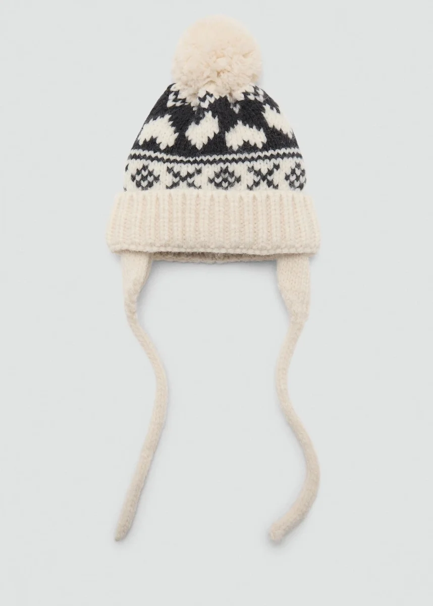 Tessuto a maglia. Disegno ricamato. Disegno a forma di cuore. Dettaglio risvolto. Nappa decorativa. Chiusura con laccio. Set disponibile. Questo cappello ha una sciarpa abbinata disponibile. Collezione Natale.