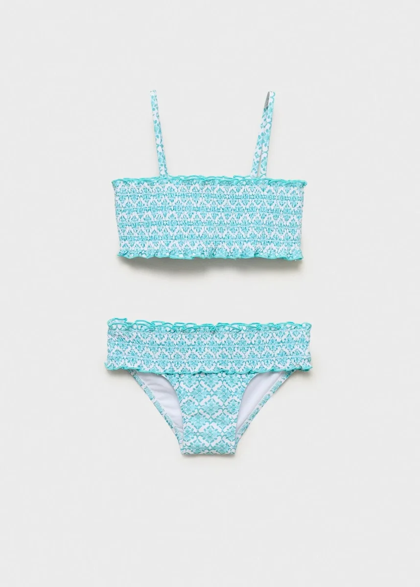 Tessuto elasticizzato. Stampa floreale. Motivo a nido d’ape. Scollo dritto. Spalline sottili. Slip classico. Dettaglio a nido d’ape in vita. Fodera interna. Prodotto in promozione.