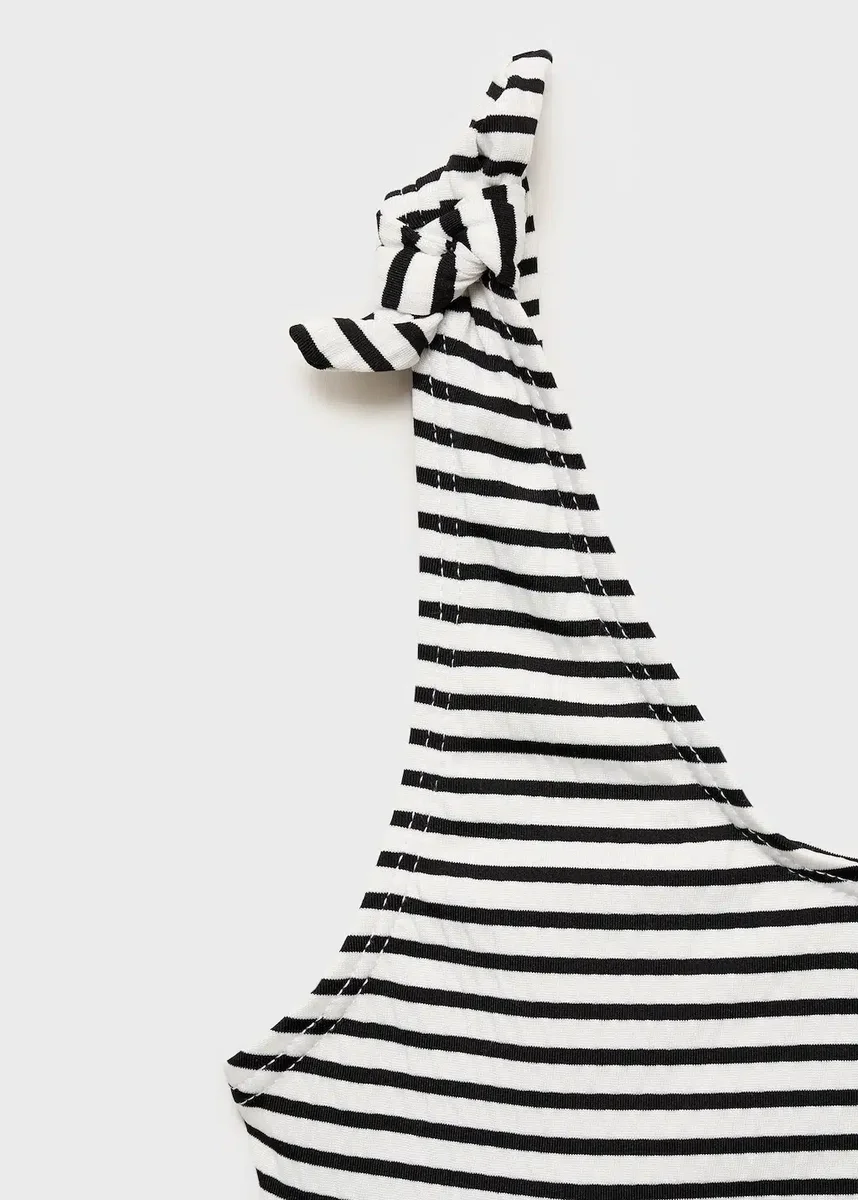 Tessuto elasticizzato. Design a righe. Girocollo. Bretelle decorative con nodo. Slip classico. Fodera interna. Collezione costumi da bagno. Prodotto promozionale