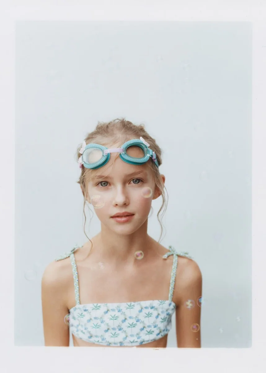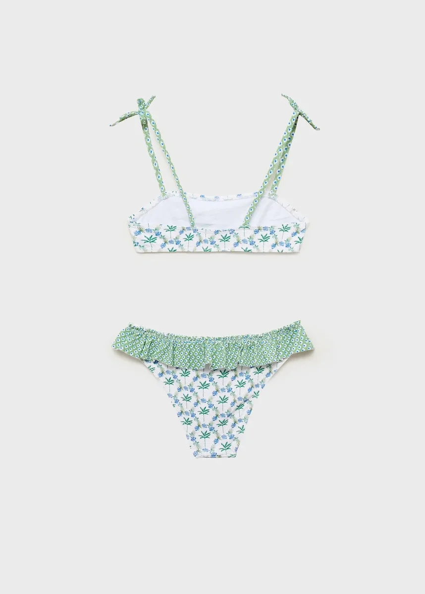 Tessuto elasticizzato. Stampa combinata. Orlo con volant. Spalline con fiocco decorativo. Prodotto in promozione.