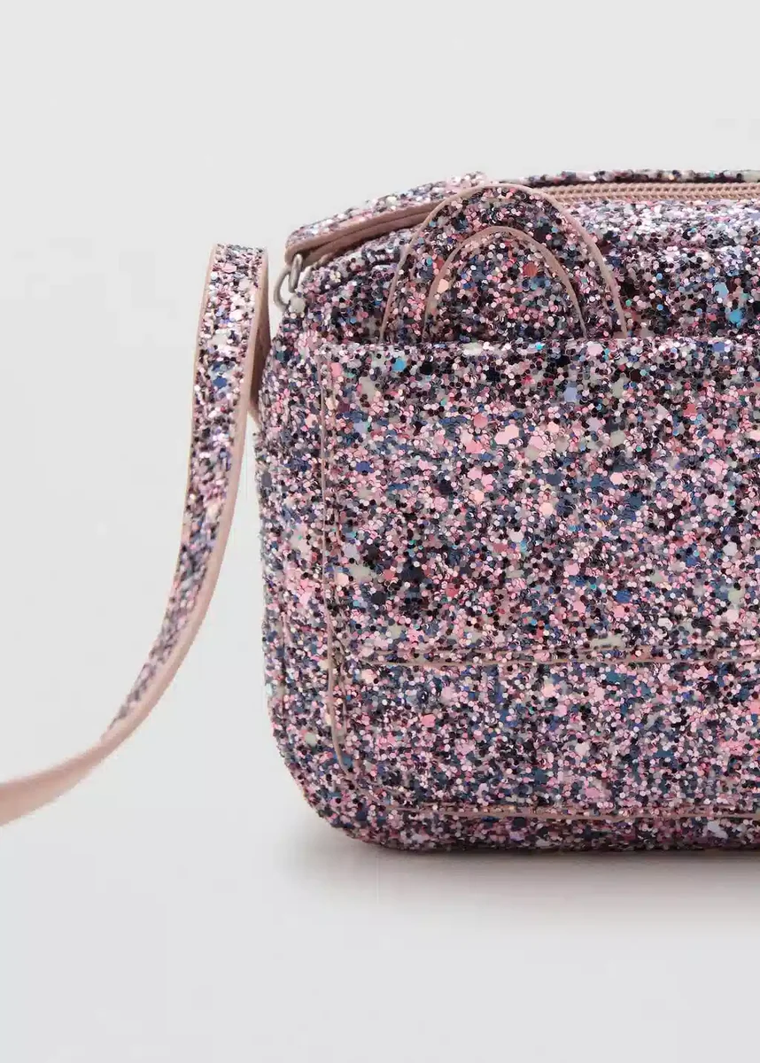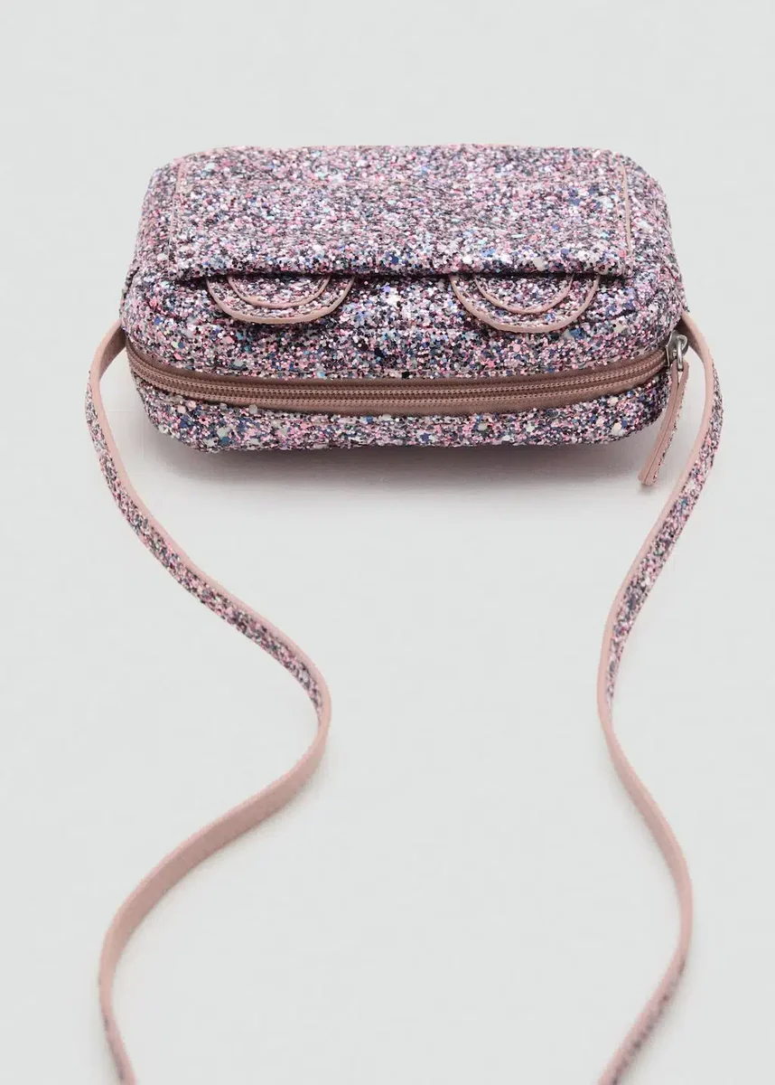Design con orecchie. Glitter rosa. Chiusura con cerniera. Manico lungo. Tasca applicata sul davanti.