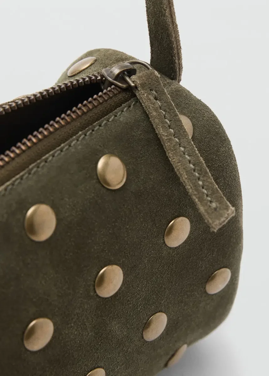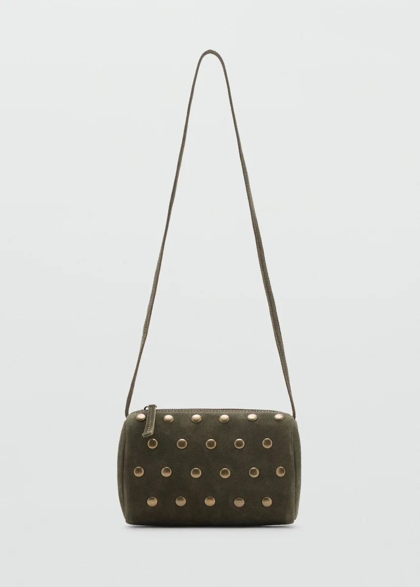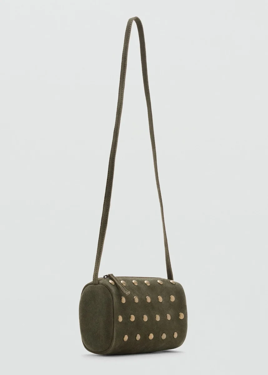 100% pelle. Design rotondo. Tracolla lunga regolabile. Chiusura con cerniera. Decorazioni con borchie.