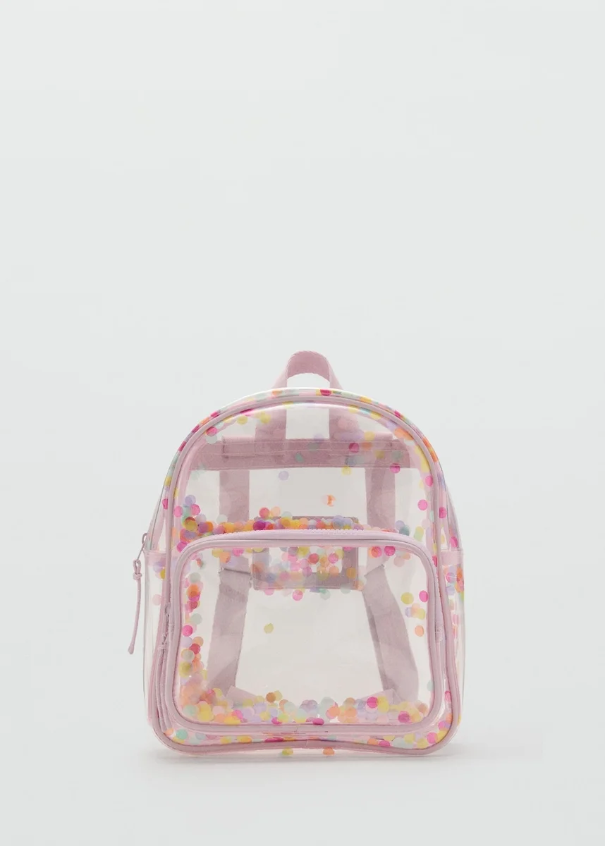 Zaino. Materiale termoplastico. Design trasparente. Tasca frontale applicata. Chiusura con cerniera. Due manici regolabili. Decorato con coriandoli.