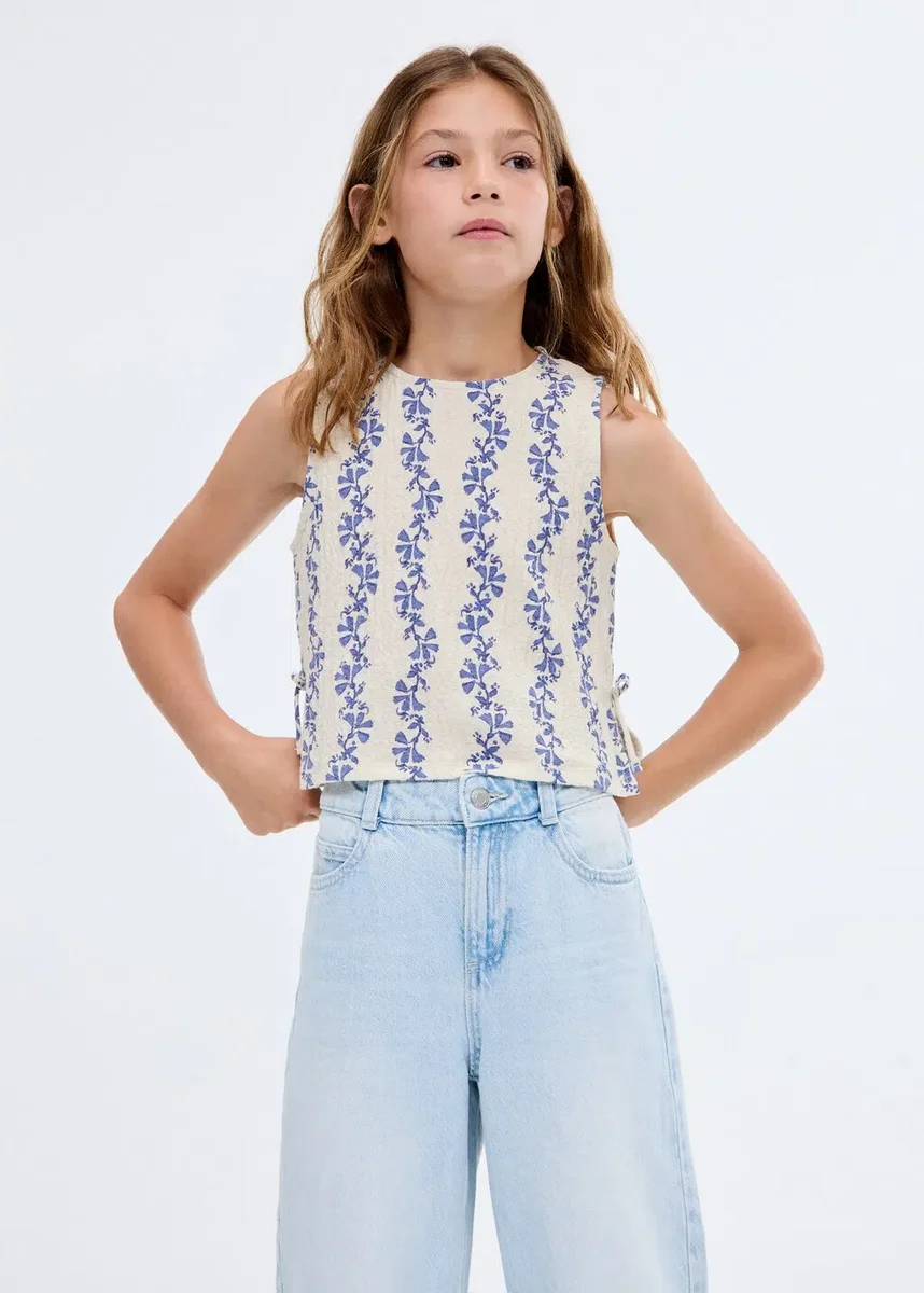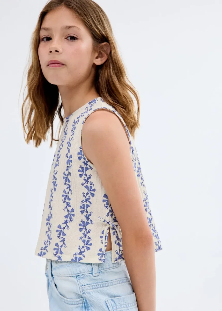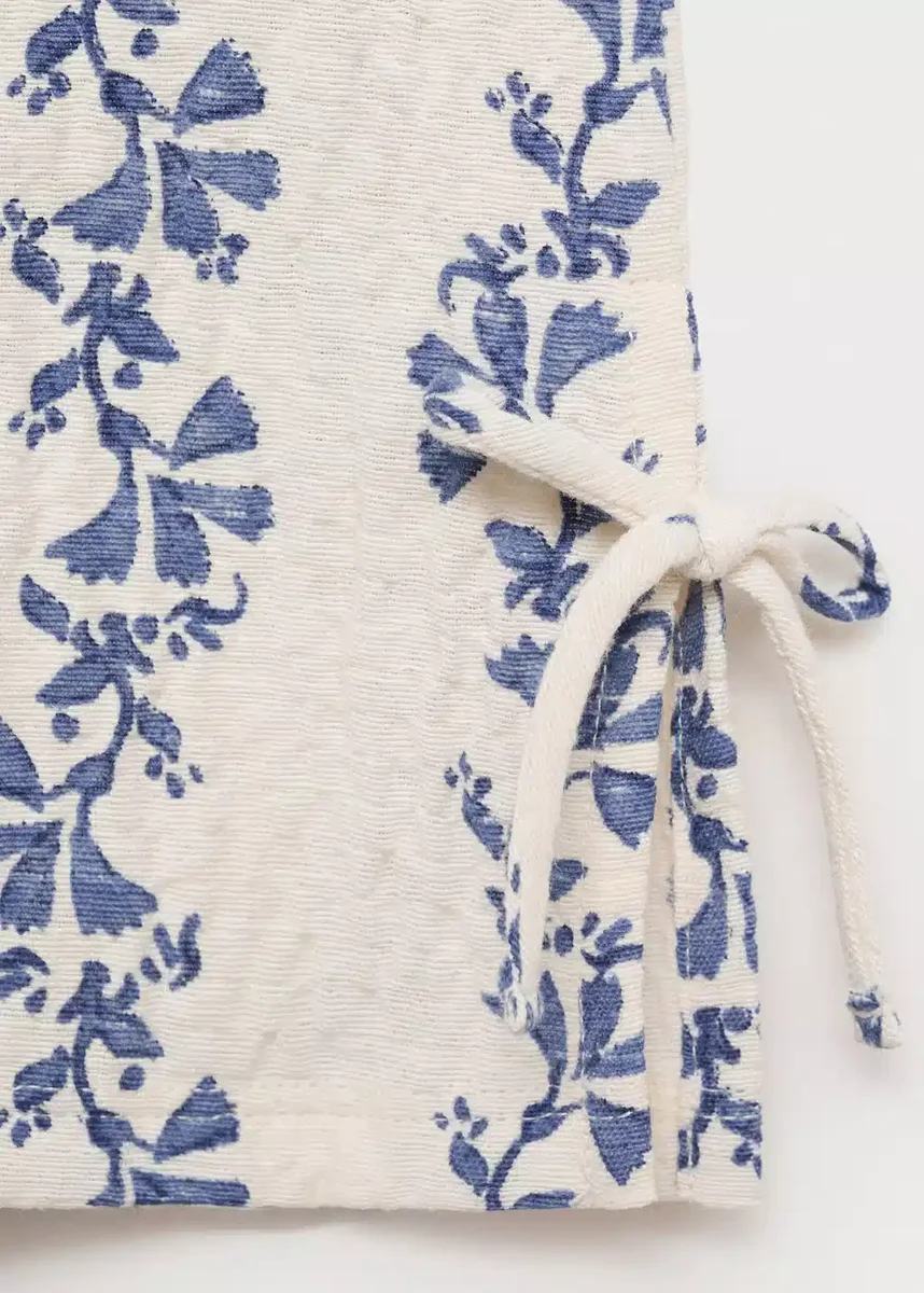 Tessuto Bambula. Motivo stampato. Stampa floreale. Girocollo. Senza maniche. Spacchi laterali. Dettagli fiocco sui lati. Chiusura con bottoni sul retro. Black Friday