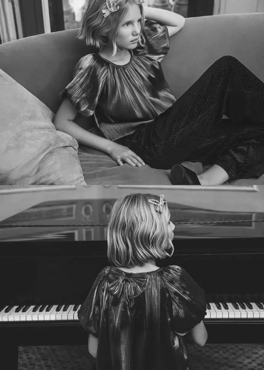 Realizzato in tessuto fluido, questo capo presenta una linea ad A e un design corto con scollo rotondo. Include una chiusura sul retro e maniche corte a sbuffo. L’effetto metallico aggiunge un tocco distintivo.