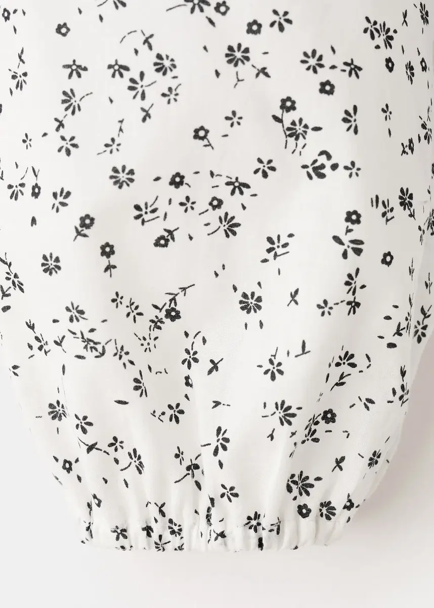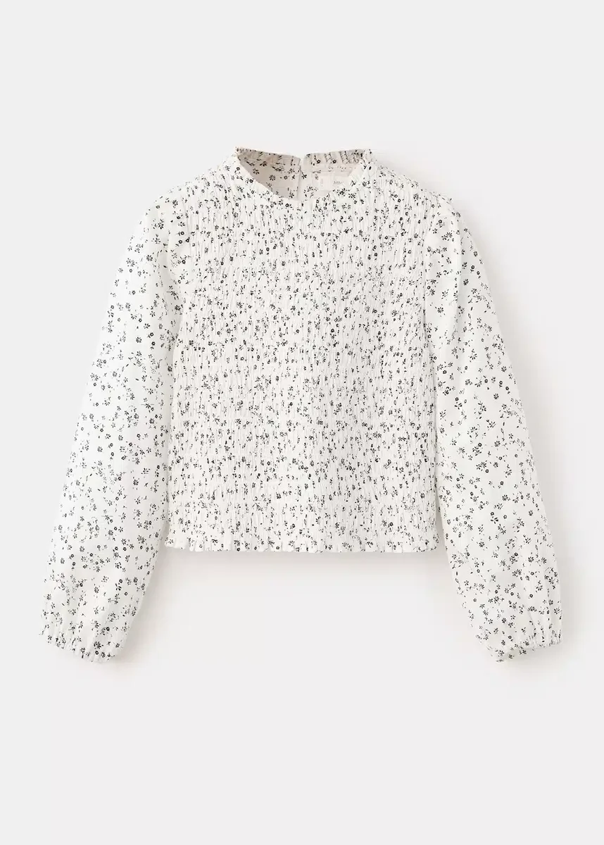 Realizzata in tessuto 100% cotone, questa blusa presenta un design dritto con stampa floreale. Il collo rotondo arricciato e la chiusura con bottoni sul retro aggiungono eleganza. Le maniche lunghe con polsini elasticizzati e arricciati, insieme al pannello smockato a nido d’ape, completano lo stile.