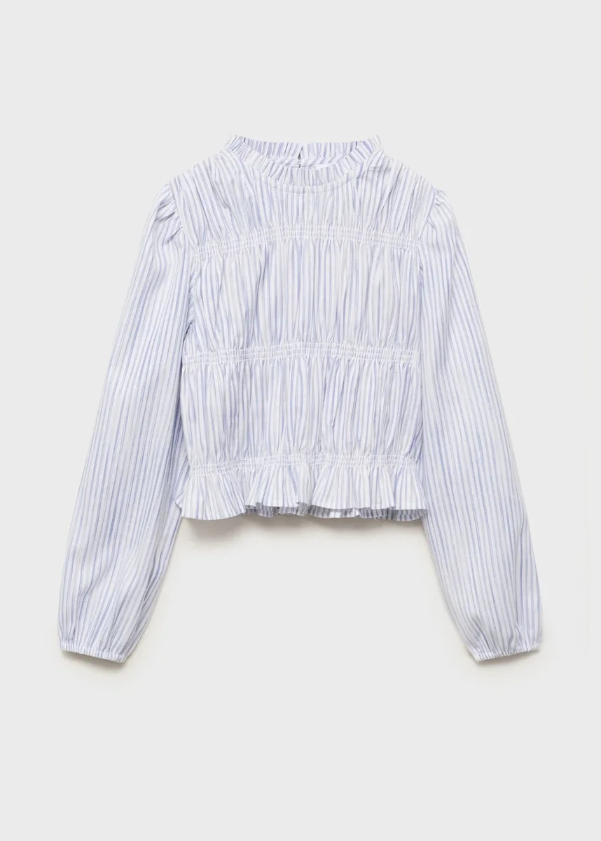 Realizzata in cotone e poliestere, questa camicetta presenta un design a righe con corpetto arricciato. Lo scollo rotondo arricciato e le maniche lunghe con polsini elasticizzati completano il suo stile dritto. Si chiude con bottoni sul retro.