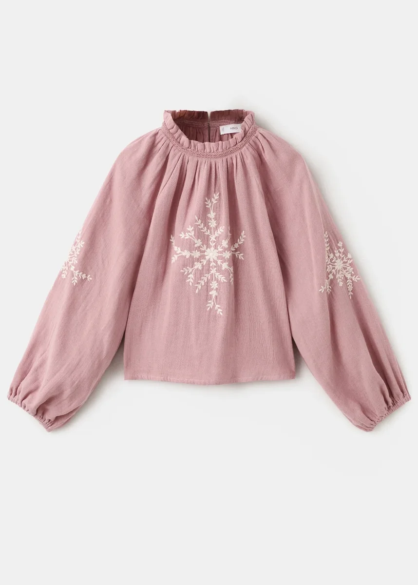 Realizzata in tessuto 100% cotone, questa camicetta presenta un design svasato con ricami floreali. Il collo rotondo arricciato e le maniche lunghe a sbuffo con polsini elasticizzati aggiungono un tocco di eleganza. Chiusura con bottoni sul retro.