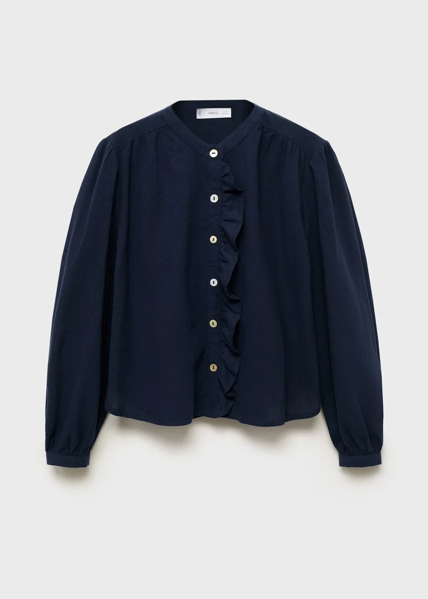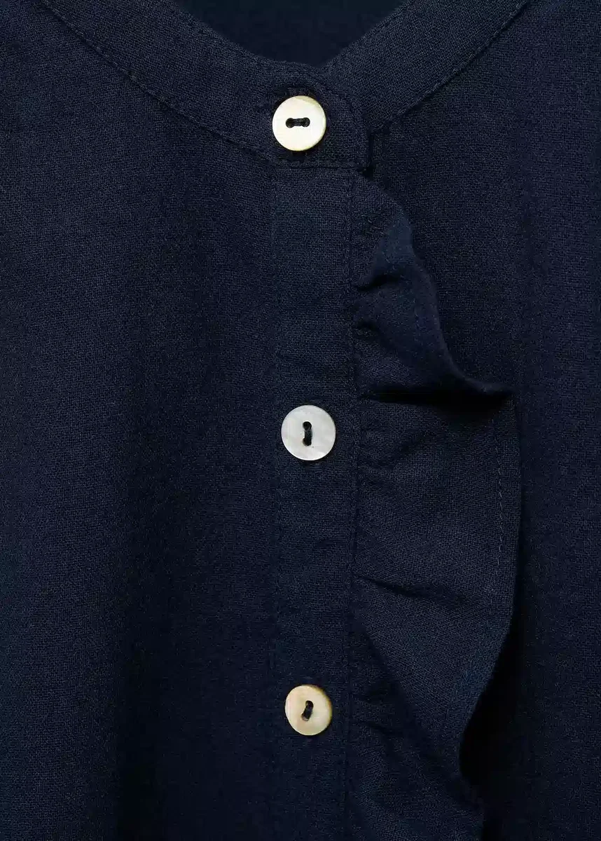 Realizzato in tessuto 100% cotone, questo capo presenta un modello dritto con scollo rotondo. Le maniche lunghe hanno polsini con bottoni e la chiusura frontale con bottoni è completata da un volant decorativo.