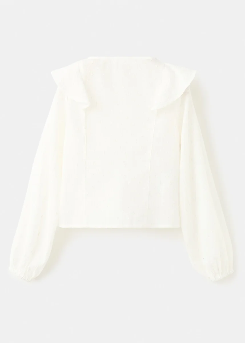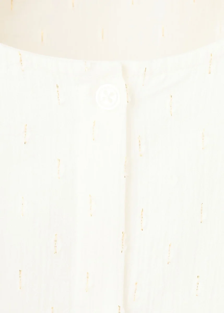 Realizzato in cotone e tessuto lurex, questo capo presenta un design dritto con scollo rotondo. Le maniche lunghe hanno polsini elasticizzati e arricciati, mentre le balze decorative aggiungono un tocco speciale. La chiusura con bottoni sul davanti completa il design.