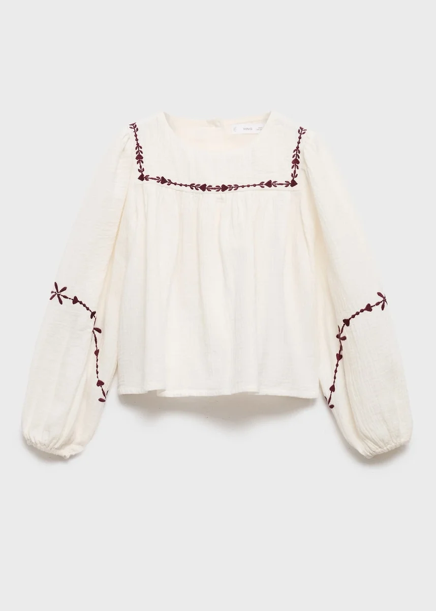Realizzato in tessuto 100% cotone stropicciato, questo capo presenta un design svasato con ricami. Il collo rotondo include una chiusura con bottoni e le maniche a sbuffo hanno polsini elasticizzati.