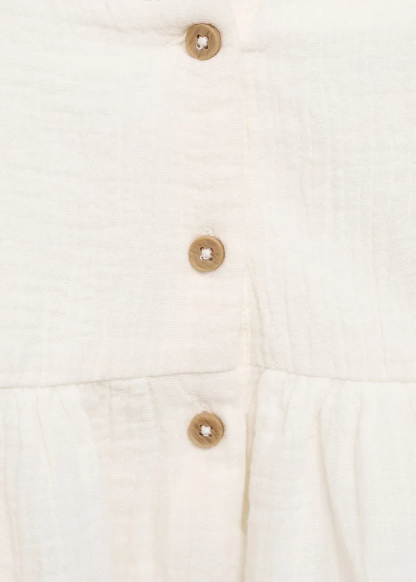 Realizzato in tessuto crinkle 100% cotone, questo capo presenta un design svasato con ricami. Lo scollo rotondo include una chiusura con bottoni e le maniche a sbuffo hanno polsini elasticizzati.