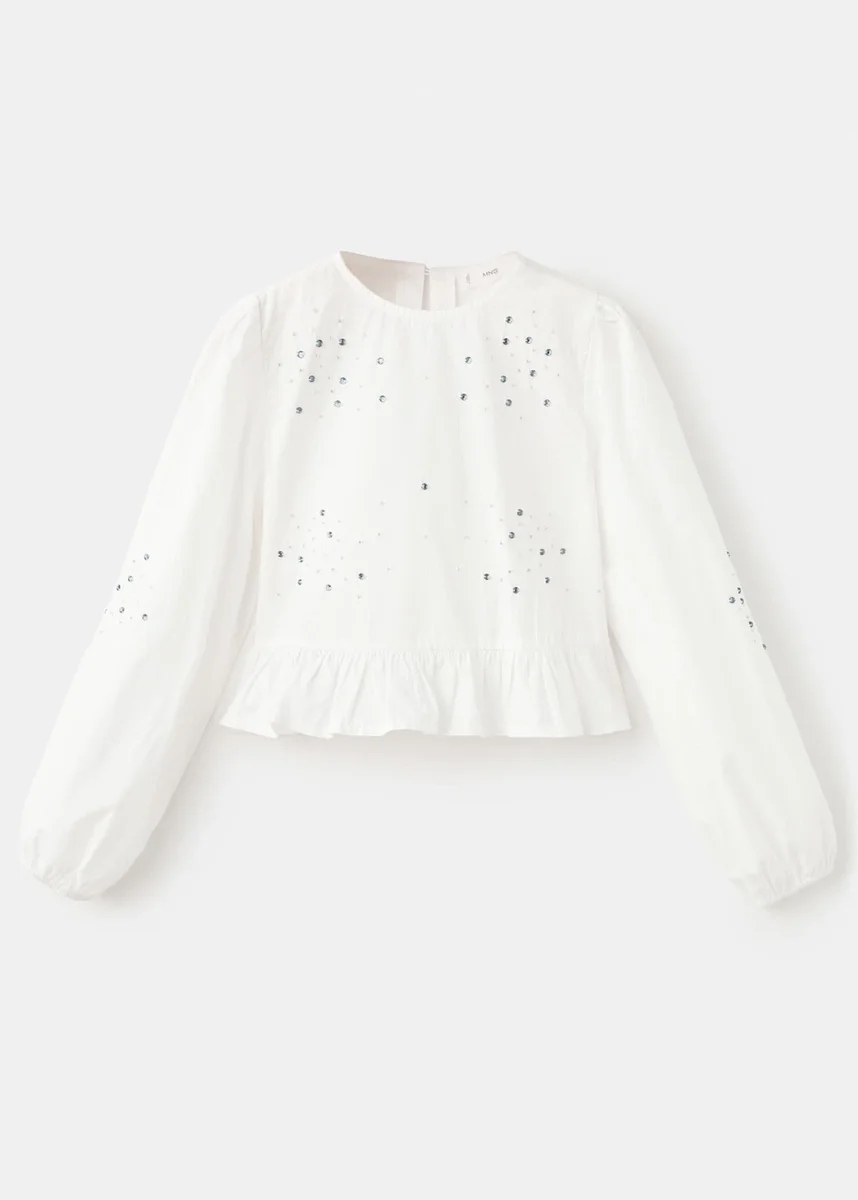 Tessuto 100% cotone. Design ricamato. Design lucido. Ricamo con microperline. Girocollo con chiusura a bottoni. Maniche lunghe a sbuffo. Polsini elasticizzati. Volant sul fondo