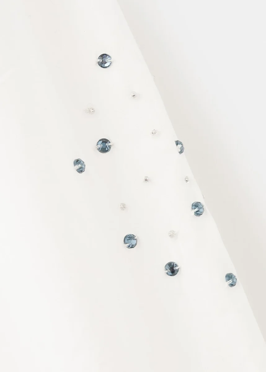 Tessuto 100% cotone. Design ricamato. Design lucido. Ricami con microperline. Girocollo con chiusura a bottoni. Maniche lunghe a sbuffo. Polsini elasticizzati. Volant sul fondo.