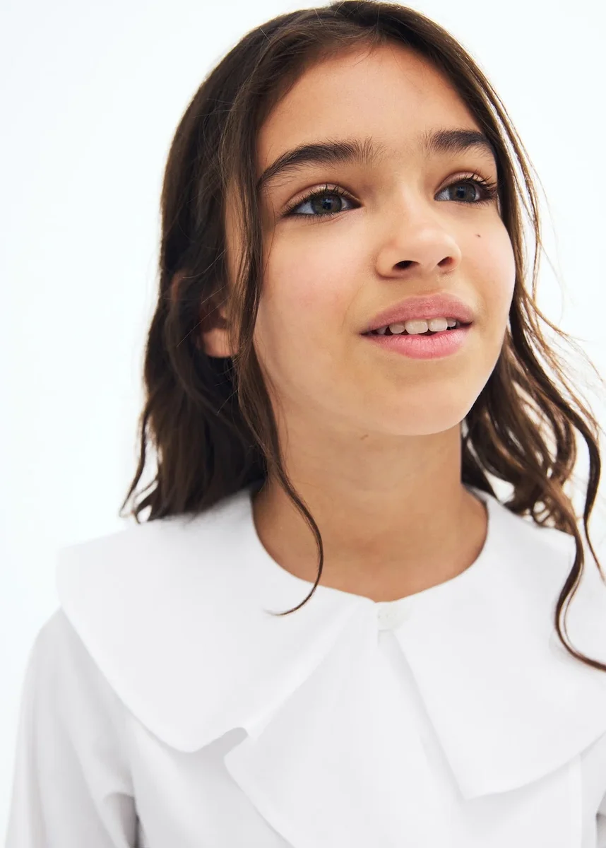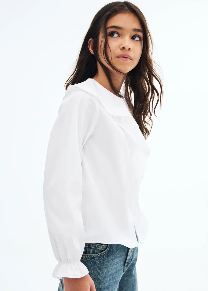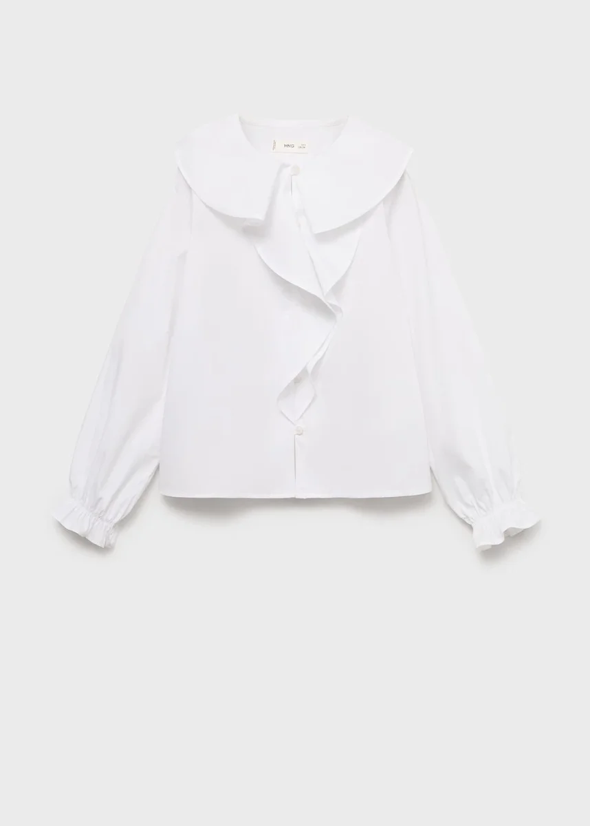 Tessuto 100% cotone. Design semplice. Colletto babydoll. Dettagli con volant. Chiusura con bottoni. Polsini arricciati.