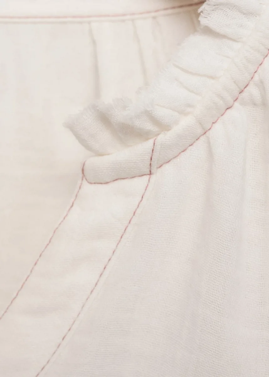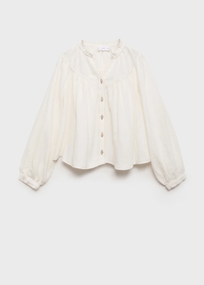 Tessuto 100% cotone. Modello lungo. Modello svasato. Scollo a V. Dettaglio arricciato sul collo. Maniche lunghe. Chiusura con bottoni. Dettaglio arricciato sui polsini.