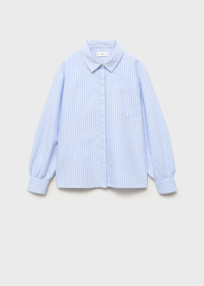 Tessuto 100% cotone. Design a righe. Colletto camicia. Maniche lunghe. Polsini con patta e bottone. Dettaglio arricciato sui polsini. Chiusura frontale con bottoni.