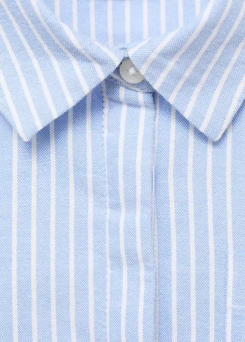 Tessuto 100% cotone. Design a righe. Colletto camicia. Maniche lunghe. Polsini con patta e bottone. Dettaglio arricciato sui polsini. Chiusura frontale con bottoni