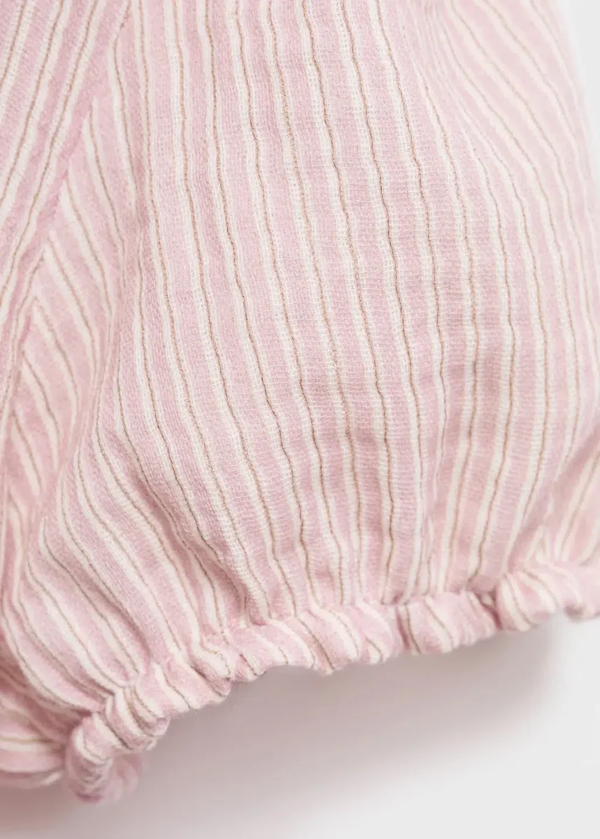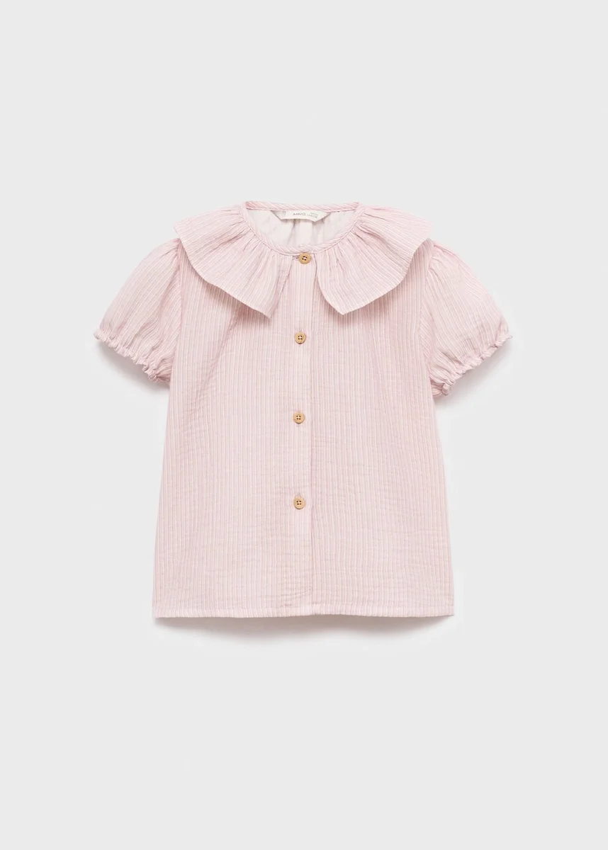 Realizzato in tessuto 100% cotone, questo capo presenta un design dritto a righe. Il colletto babydoll gli conferisce un tocco distintivo, mentre le maniche corte arricciate e la chiusura con bottoni sul davanti completano il look.