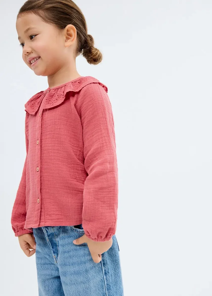 Tessuto 100% cotone. Tessuto bambula. Modello dritto. Girocollo. Colletto babydoll. Maniche lunghe con polsini elasticizzati. Chiusura frontale con bottoni