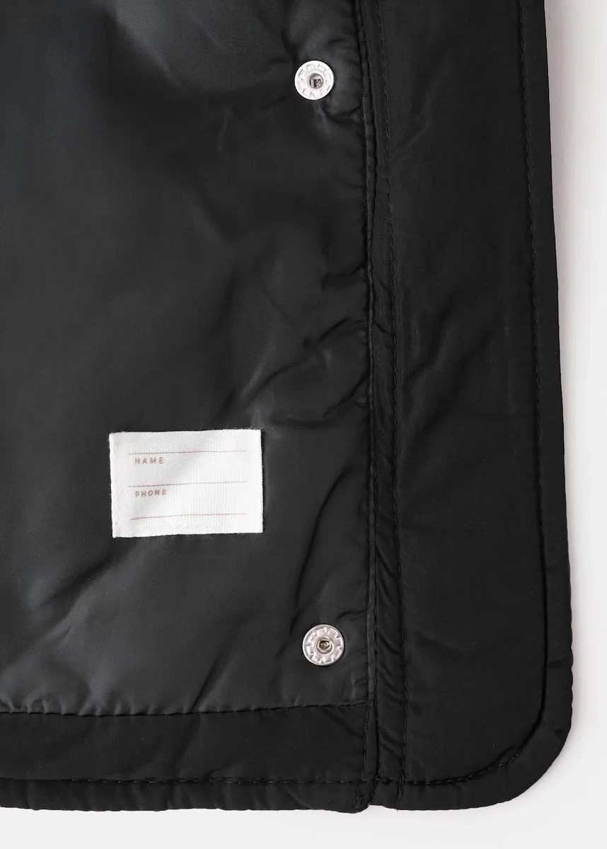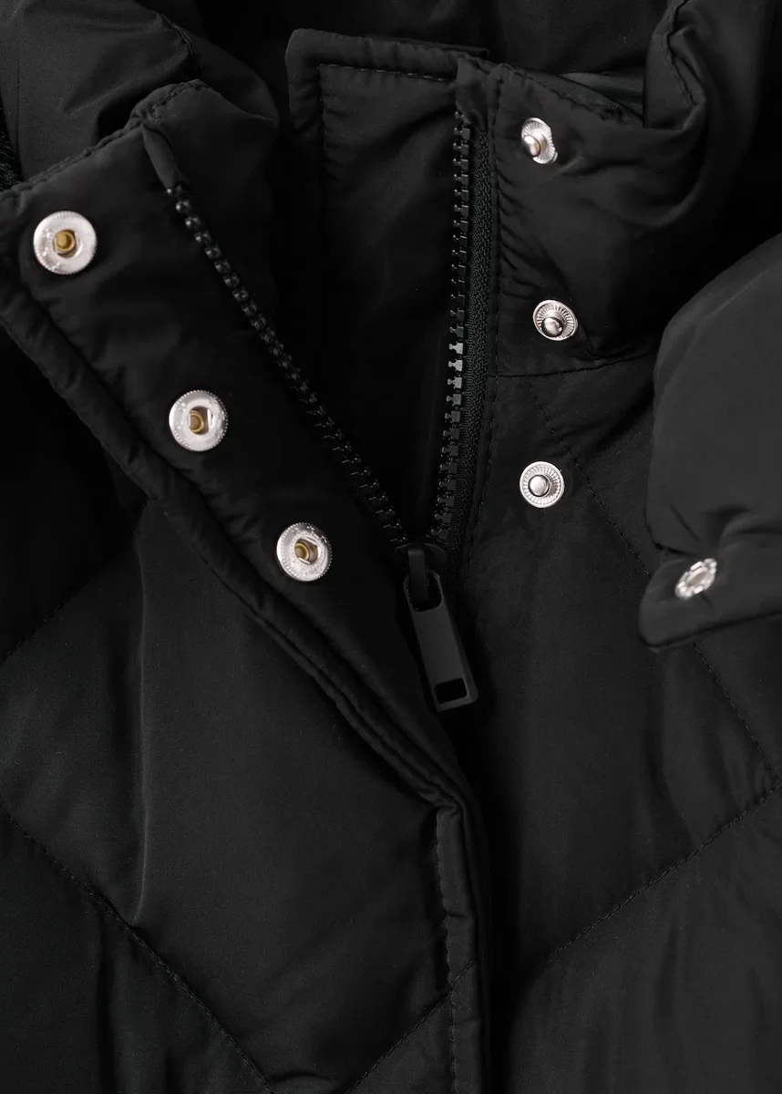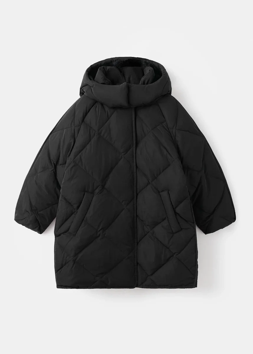 50% tessuto in piuma d’anatra. Tessuto trapuntato. Taglio lungo. Con cappuccio. Maniche lunghe. Chiusura con bottoni e cerniera. Due tasche laterali.