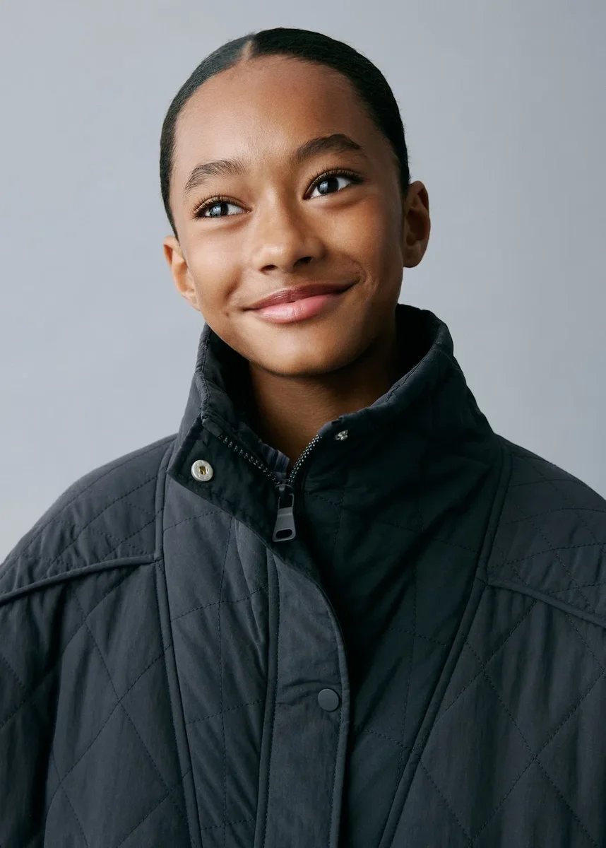 Tessuto in poliammide. Tessuto testurizzato. Design ampio. Design lungo. Silhouette oversize. Collo con risvolto. Collo a imbuto. Chiusura frontale con zip e bottoni