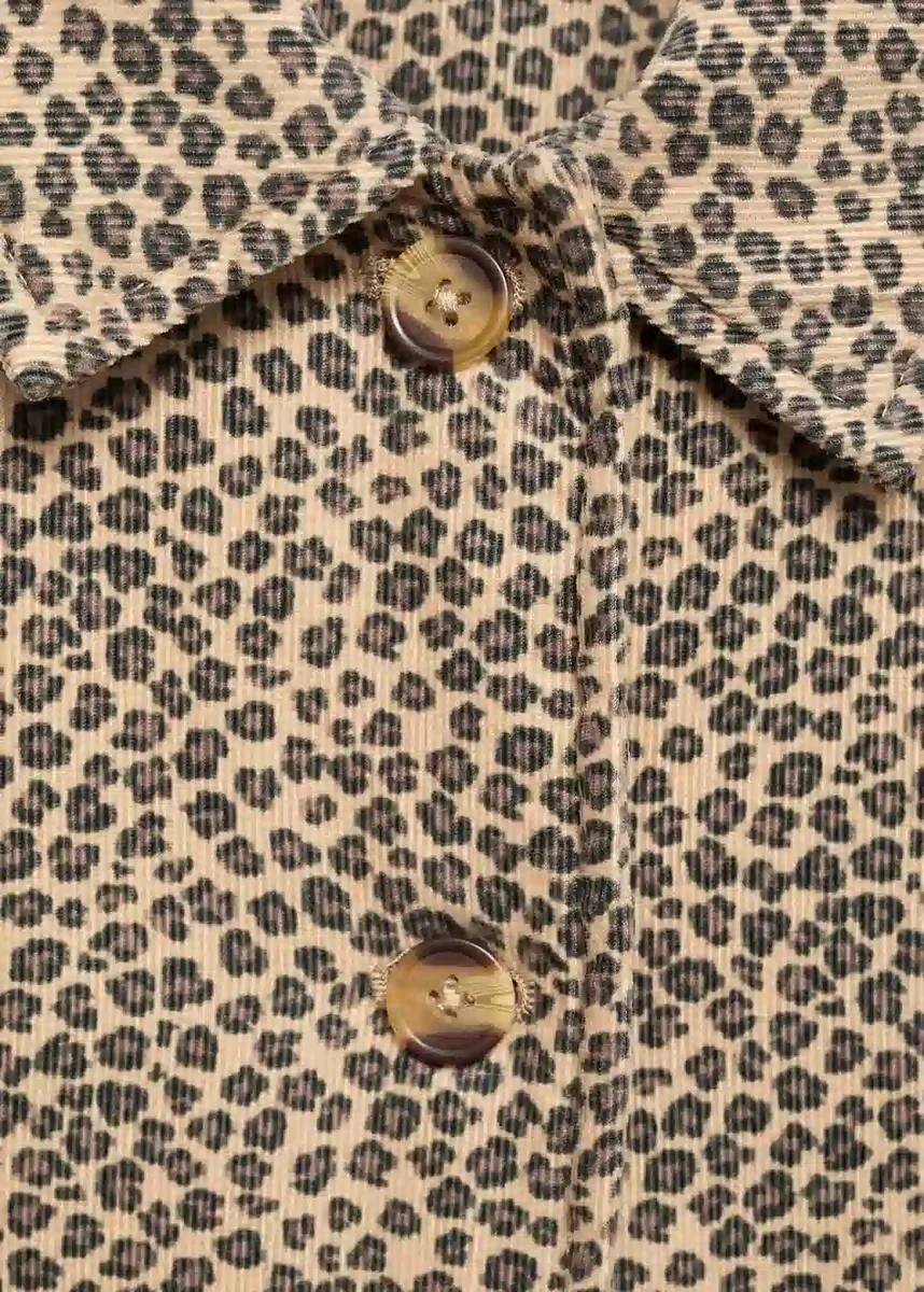 Tessuto 100% cotone. Tessuto velluto a coste. Tessuto con stampa animalier. Stampa leopardata. Colletto camicia. Maniche lunghe con polsini elasticizzati. Chiusura frontale con bottoni. Due tasche applicate sul davanti. Fodera interna in cotone